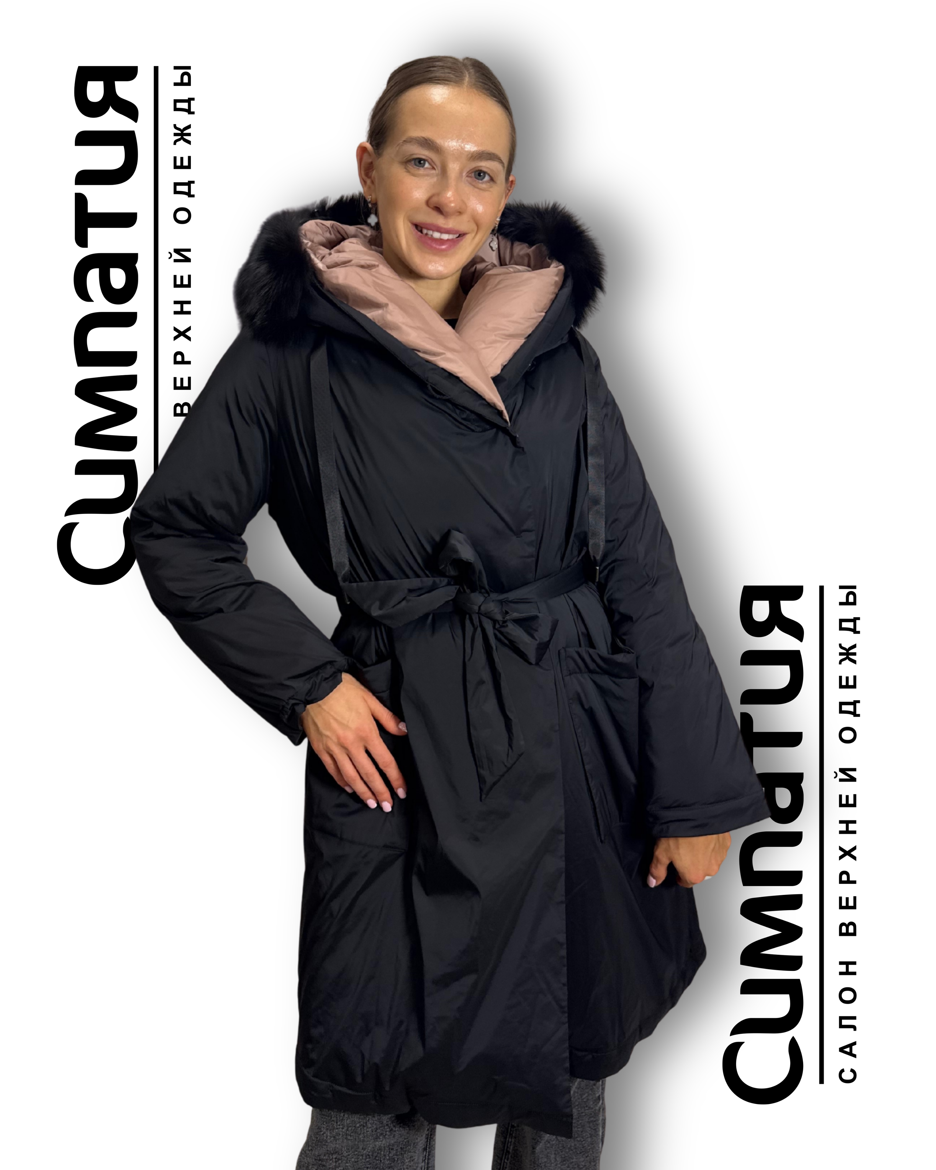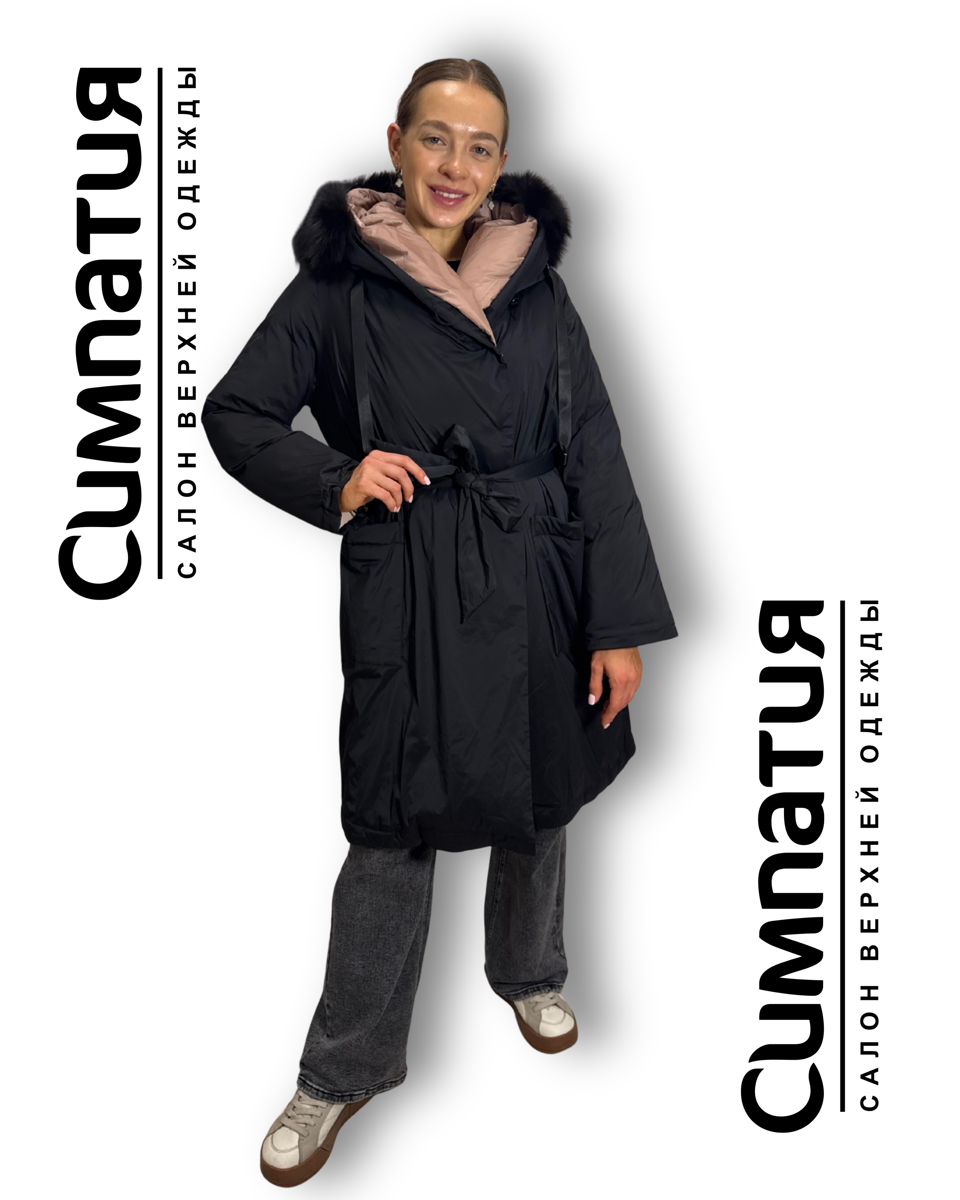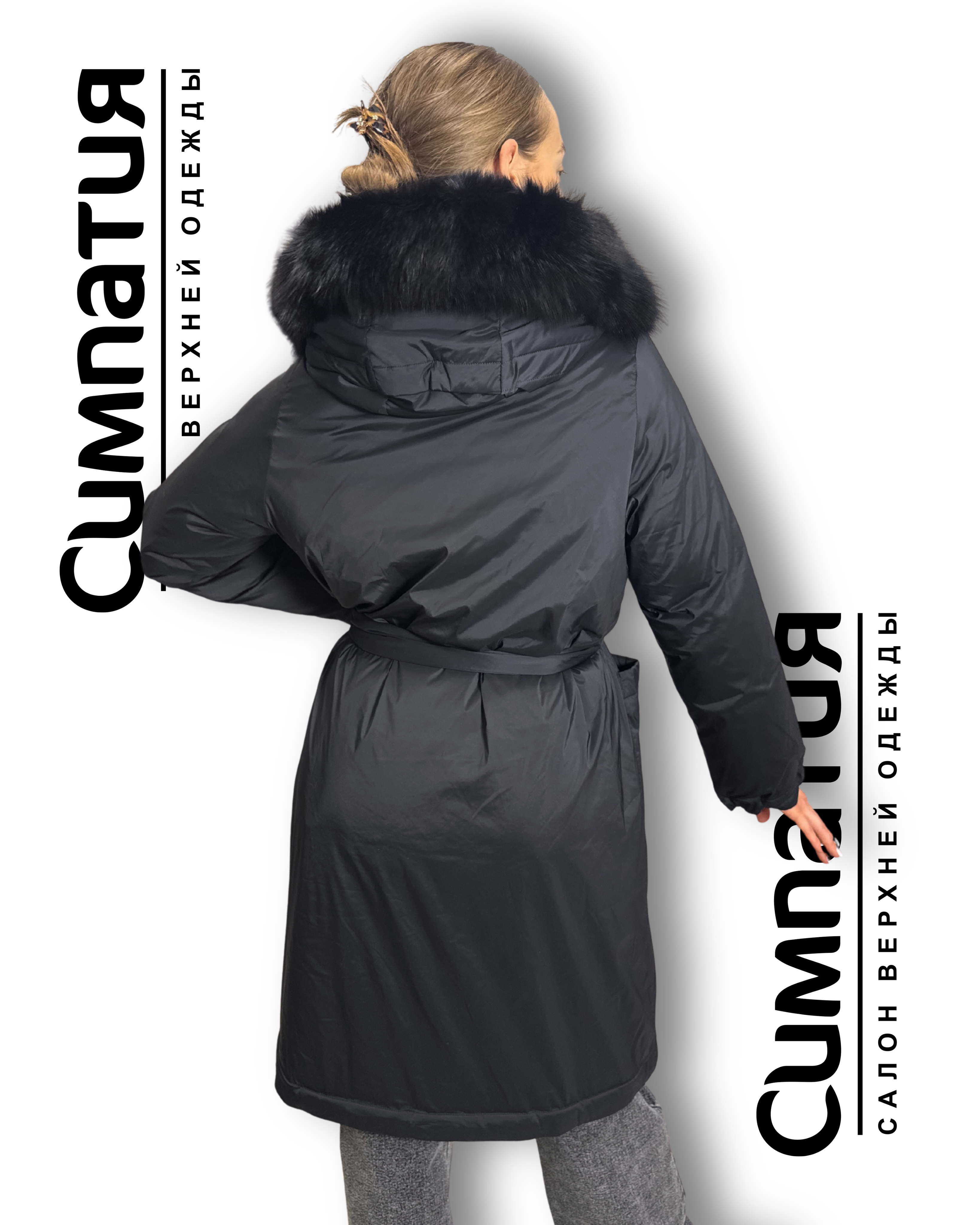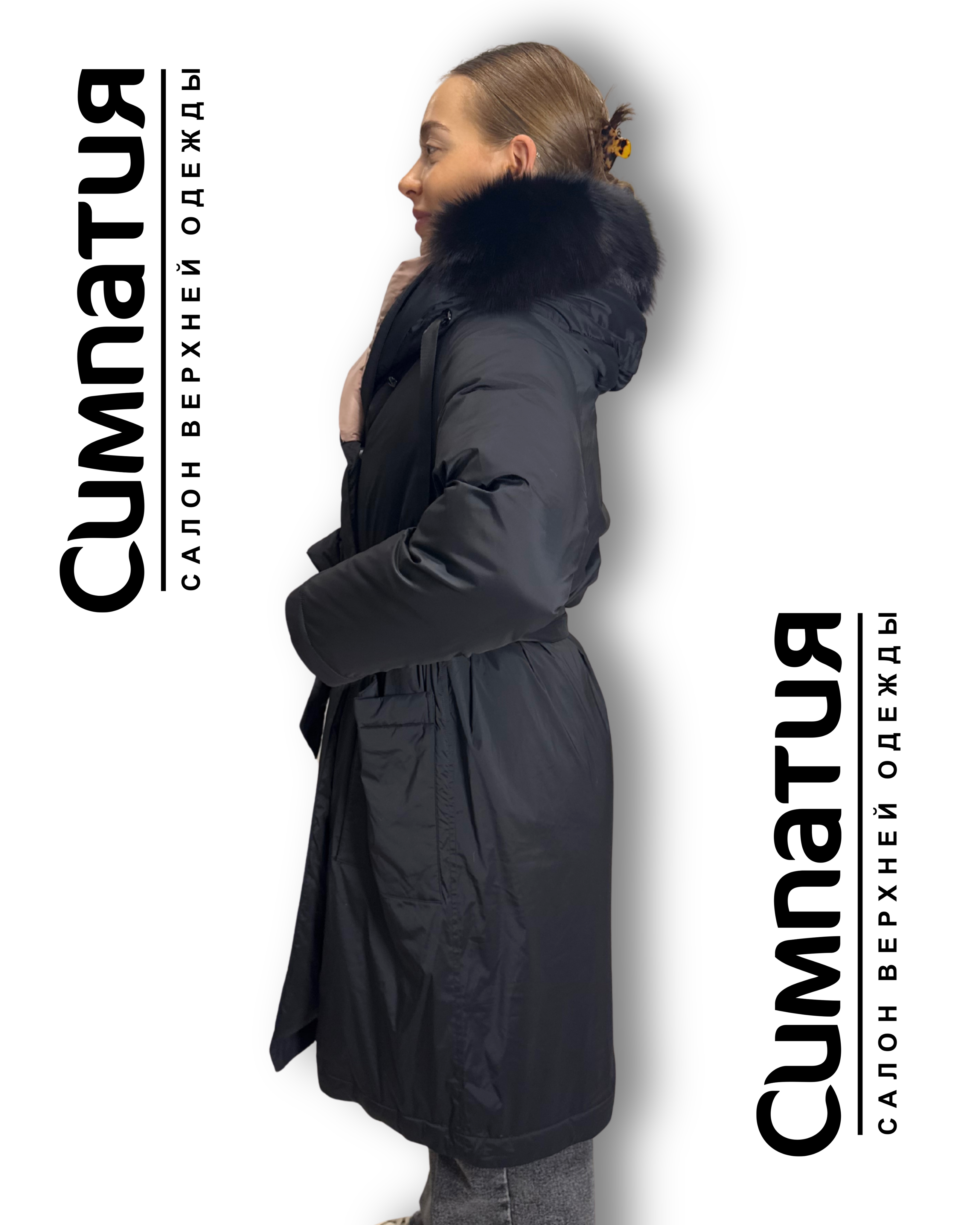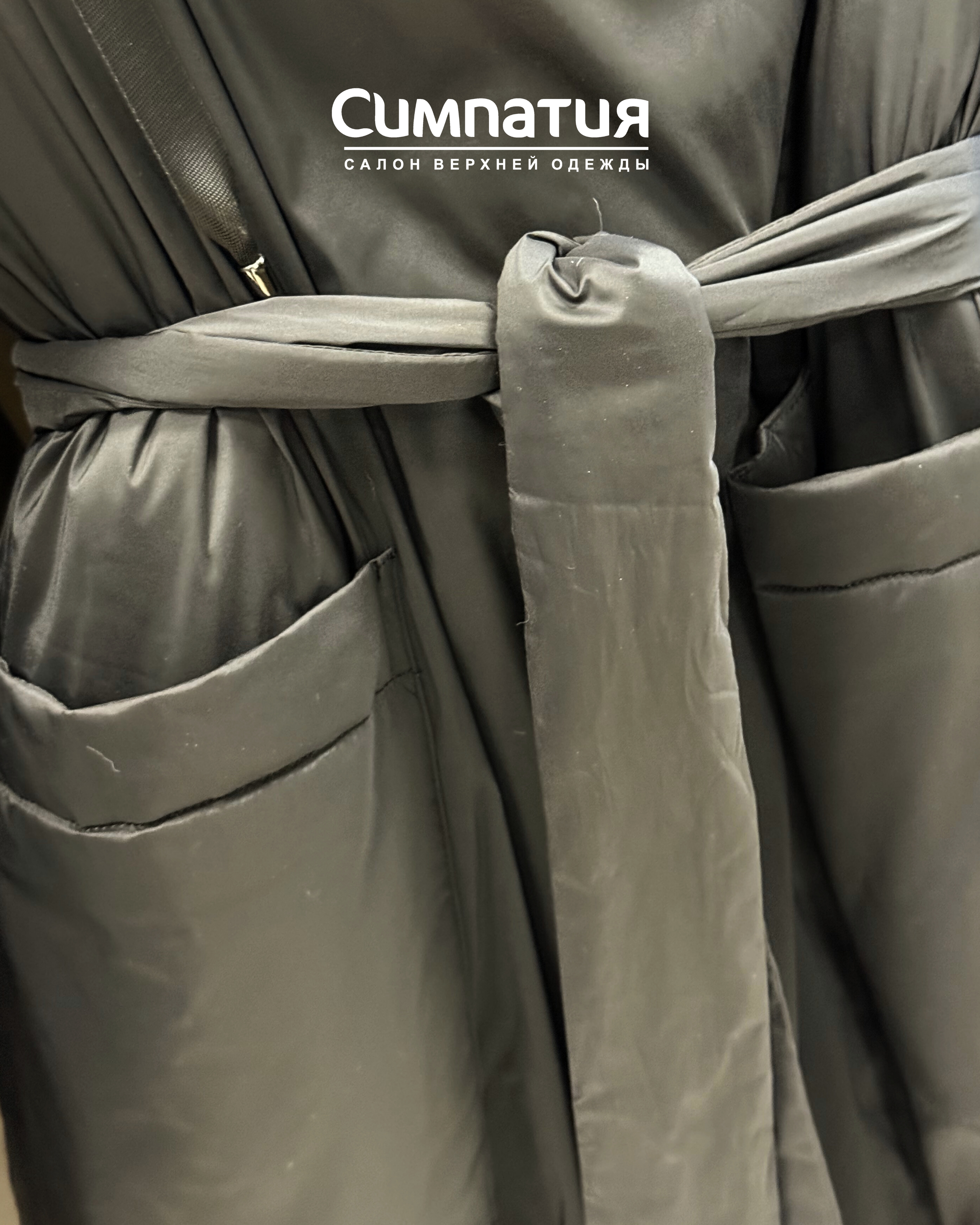 Классический пуховик свободного кроя, но с поясом и возможностью приталивания в черном цвете. С глубокими накладными карманами, так же на капюшоне контрастная вставка. Застегивается на молнию и кнопки.