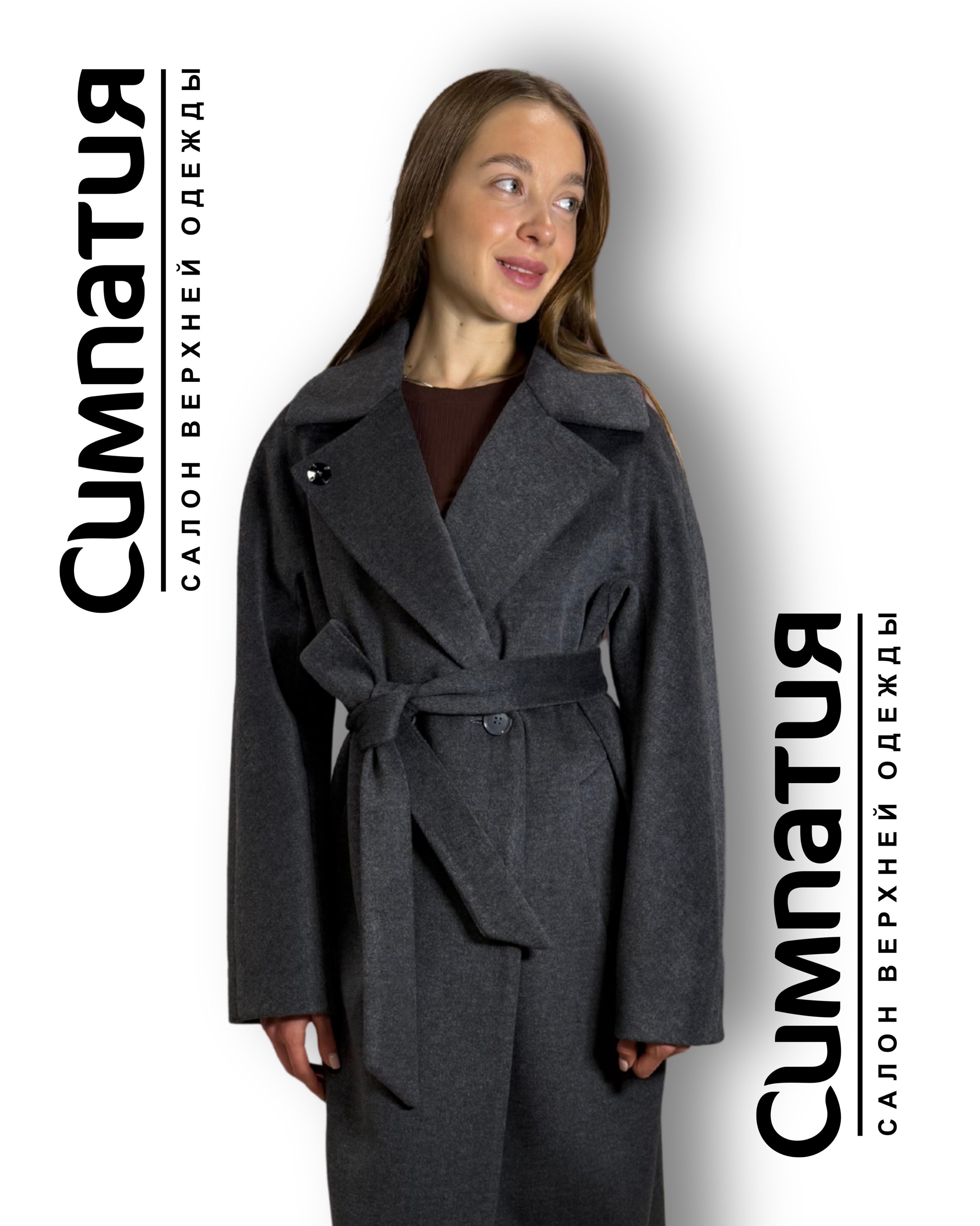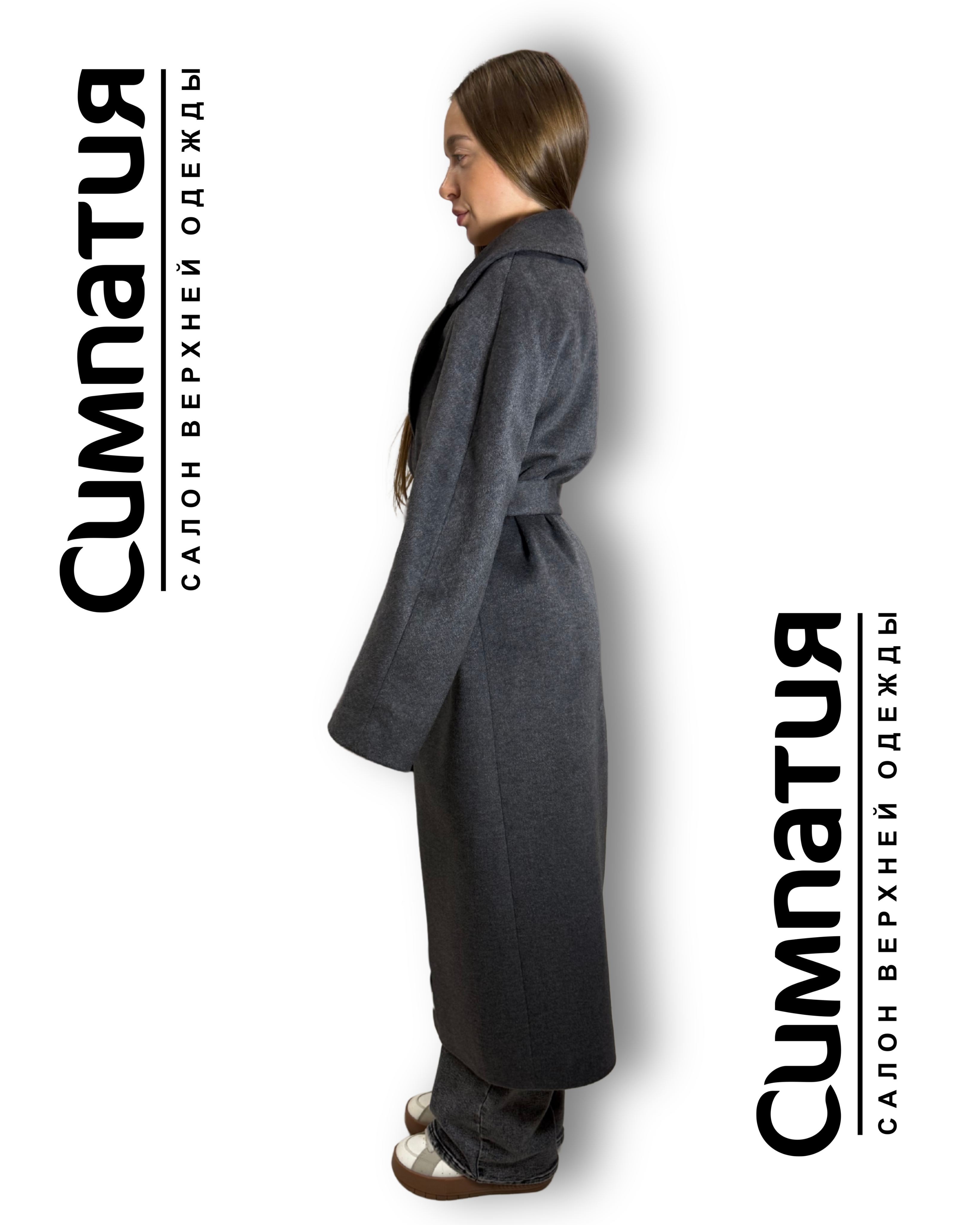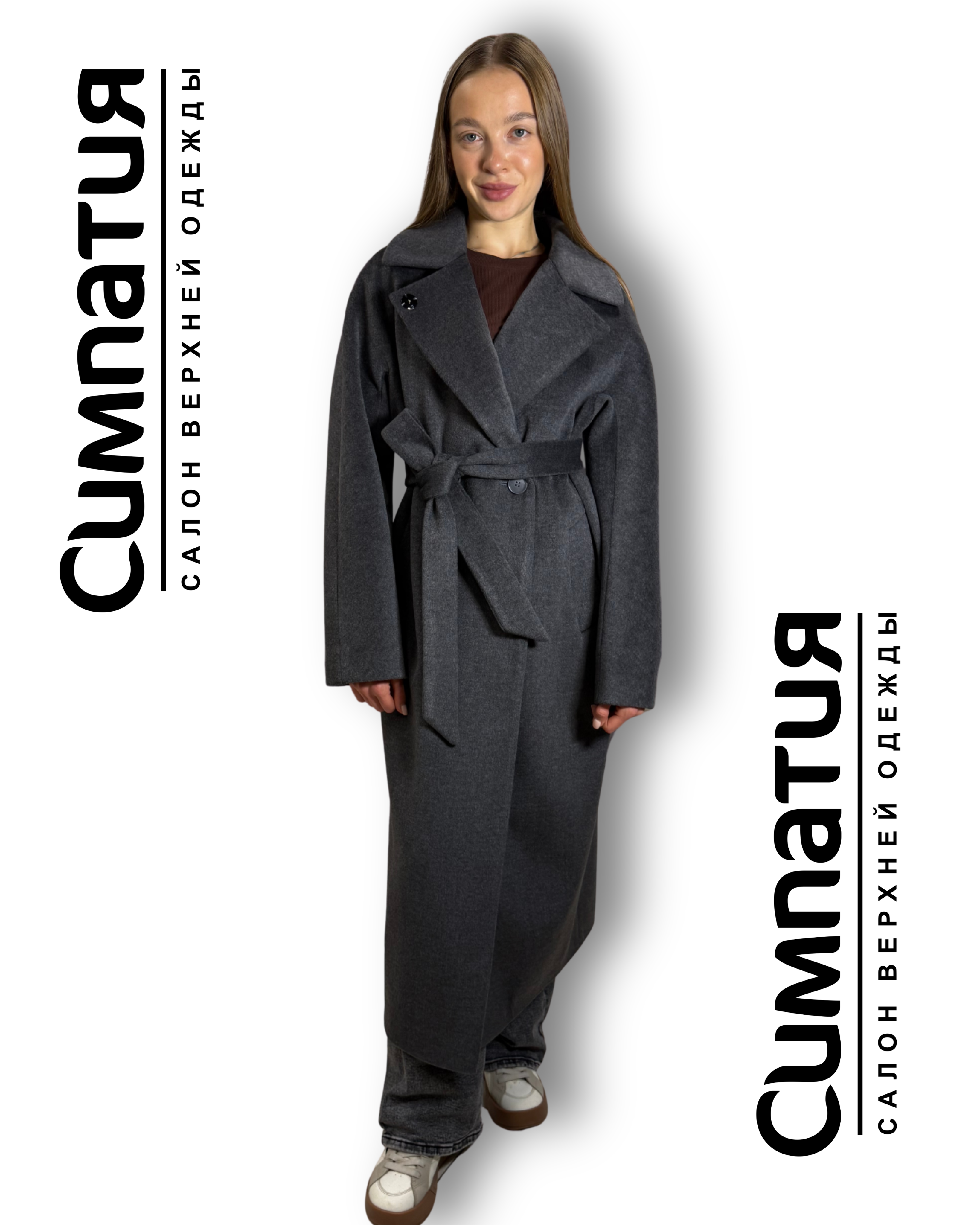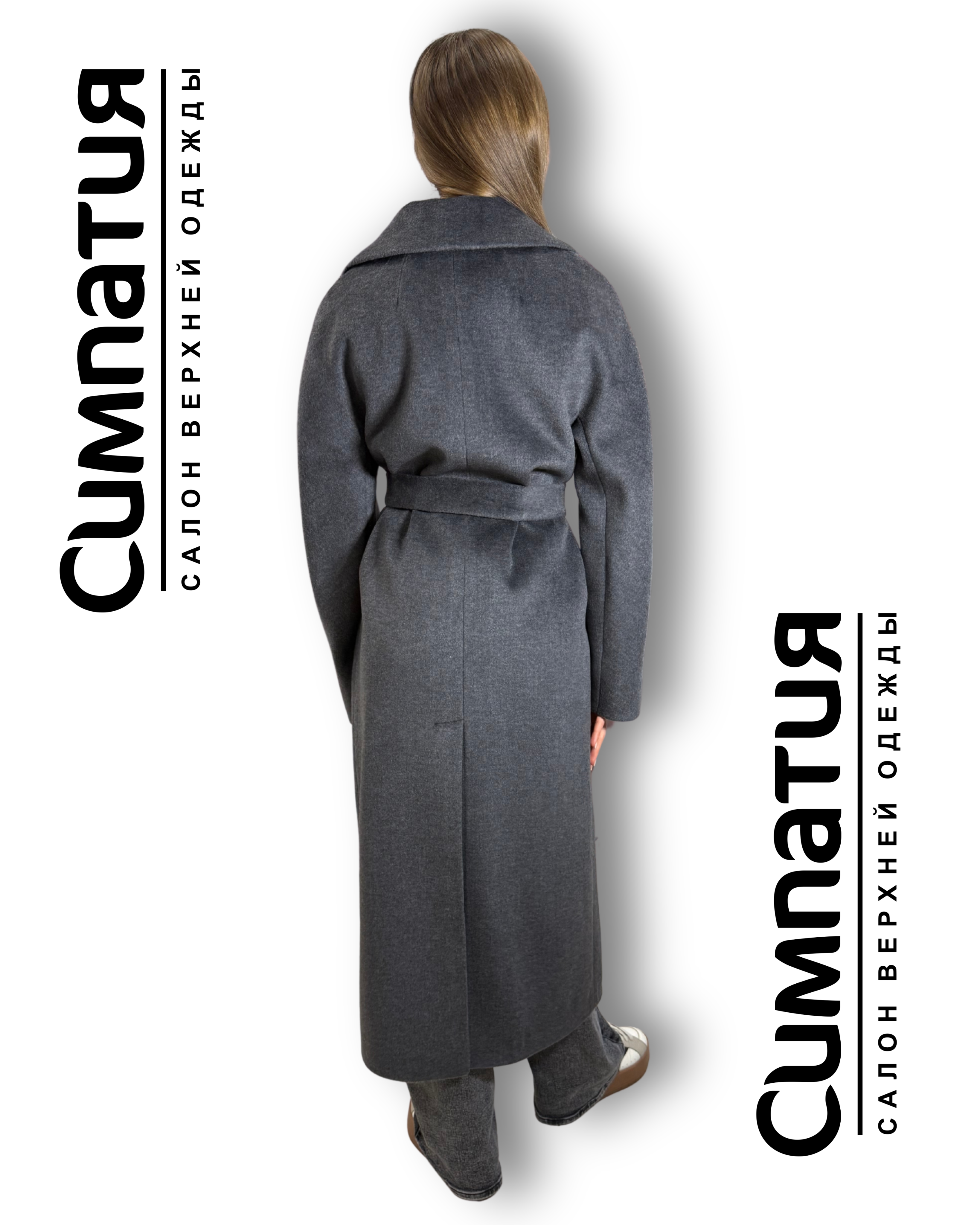 Классическое пальто из драпа в сером цвете с поясом