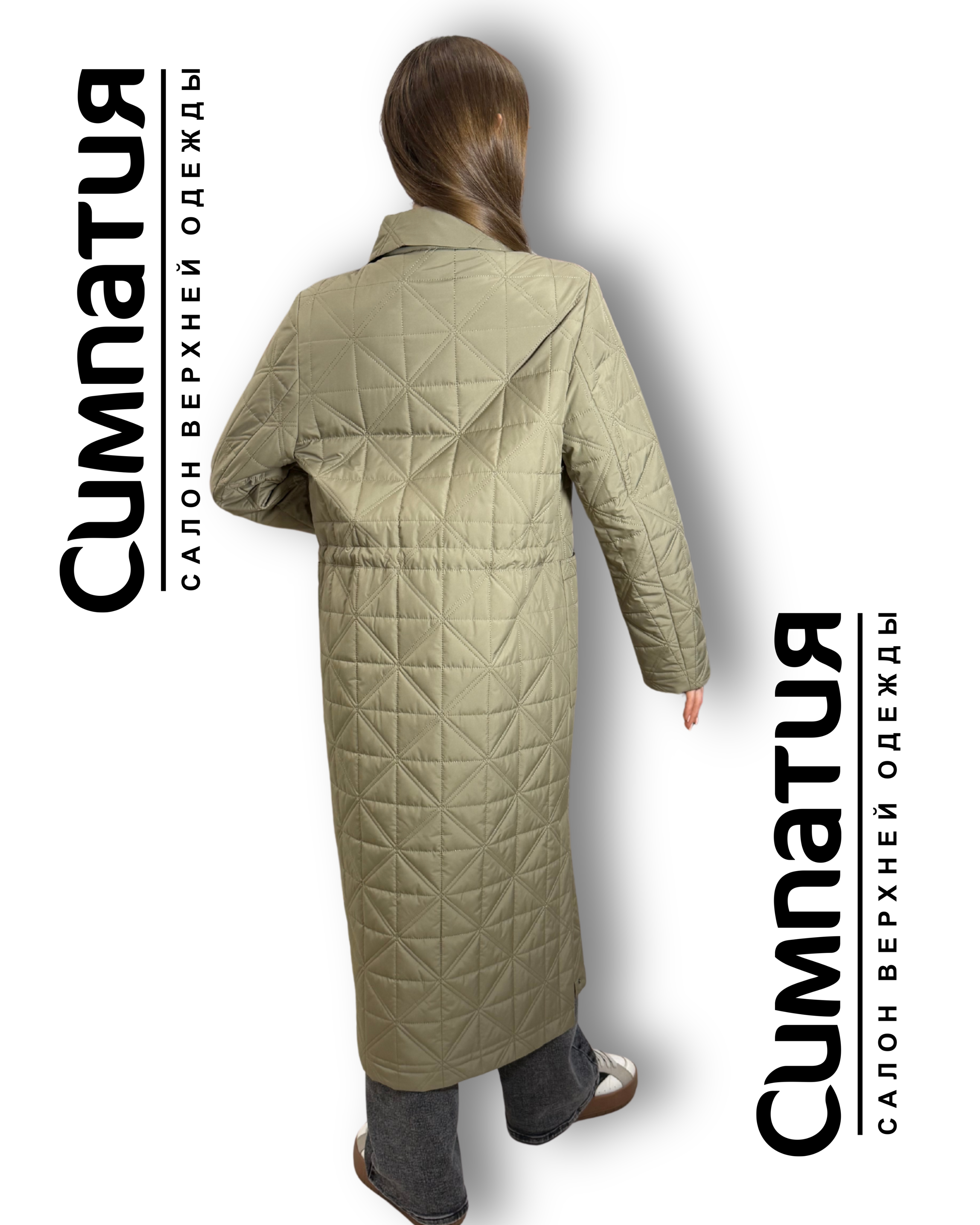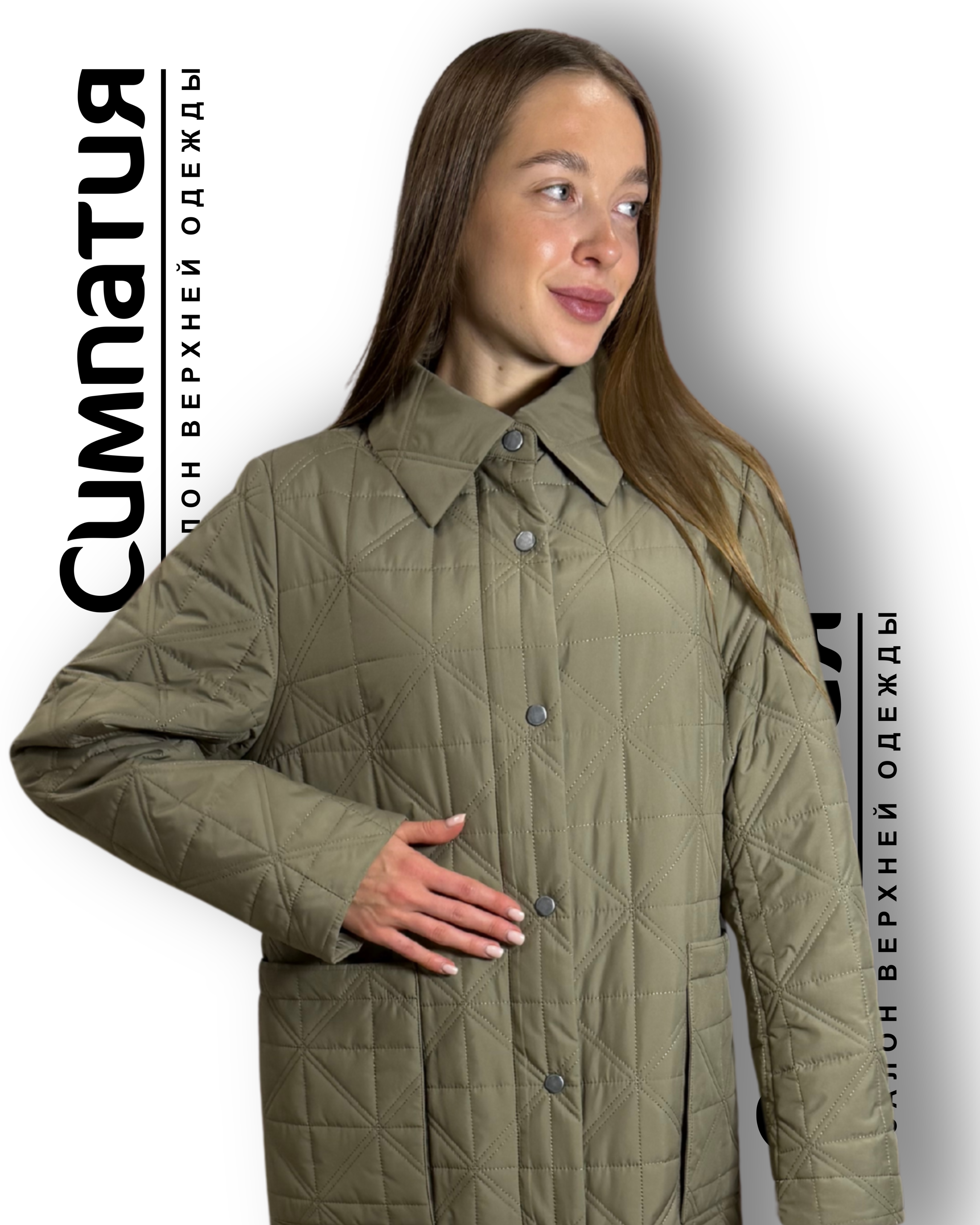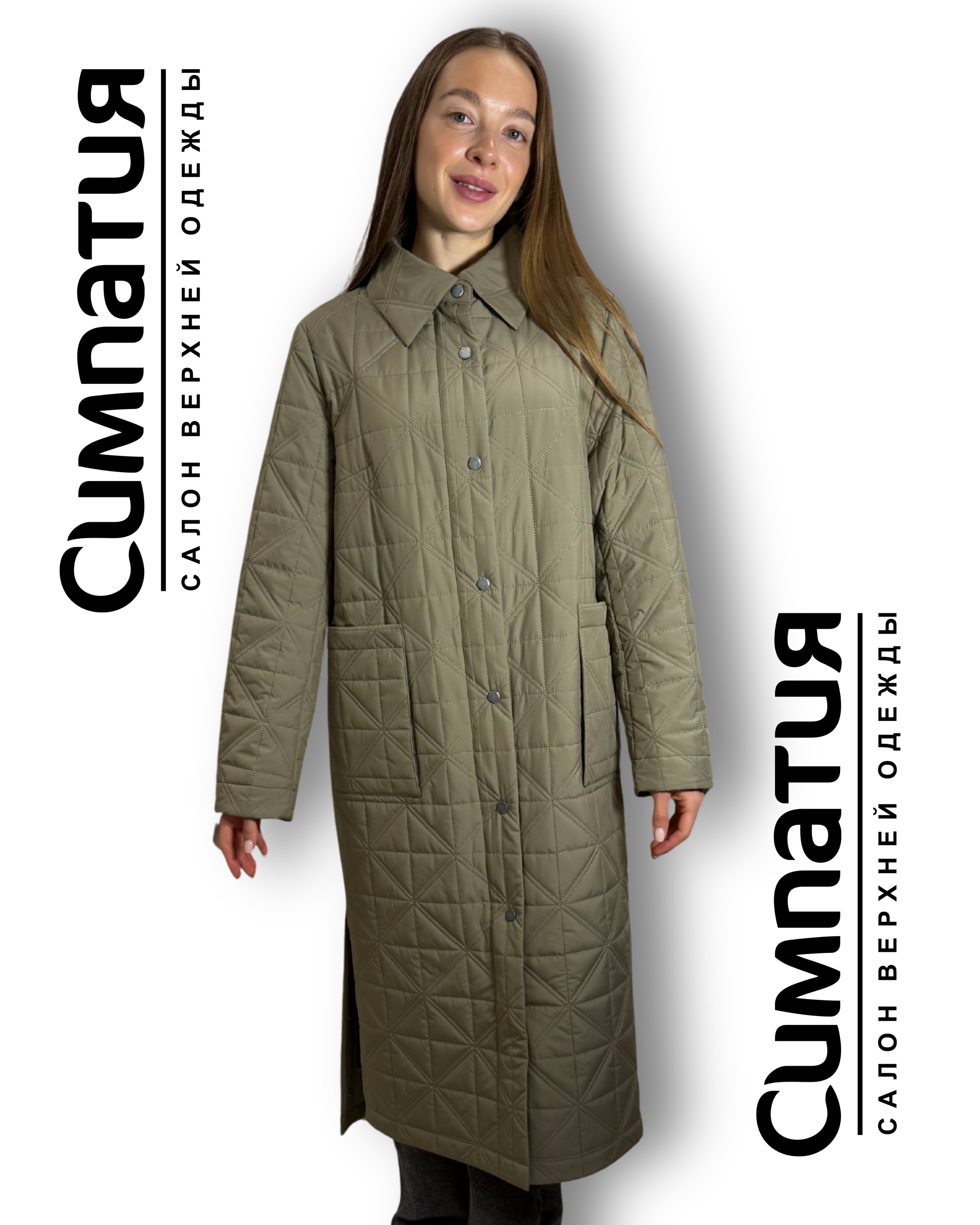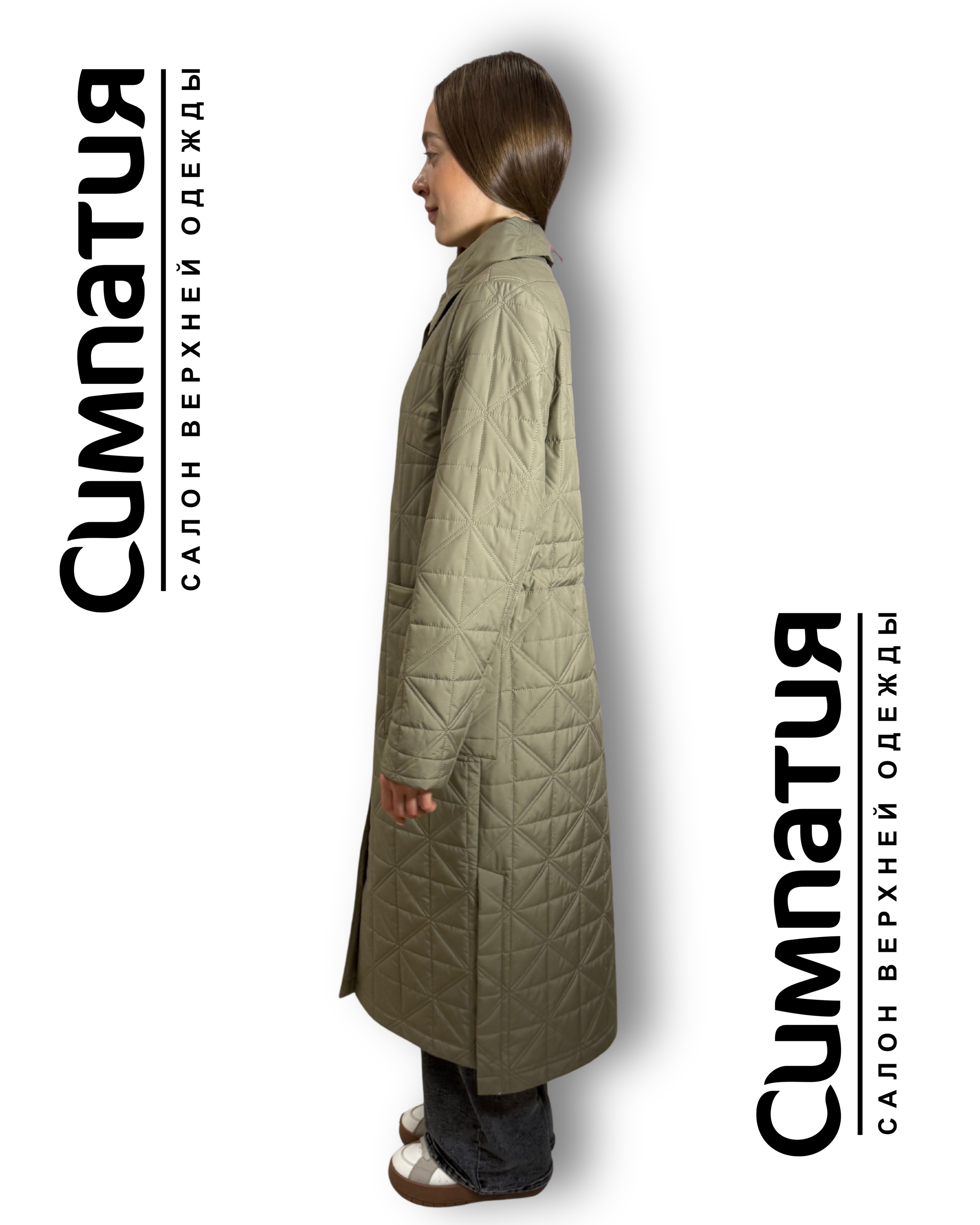 Куртка свободного кроя в длине макси с аккуратными накладными карманами в хаки цвете