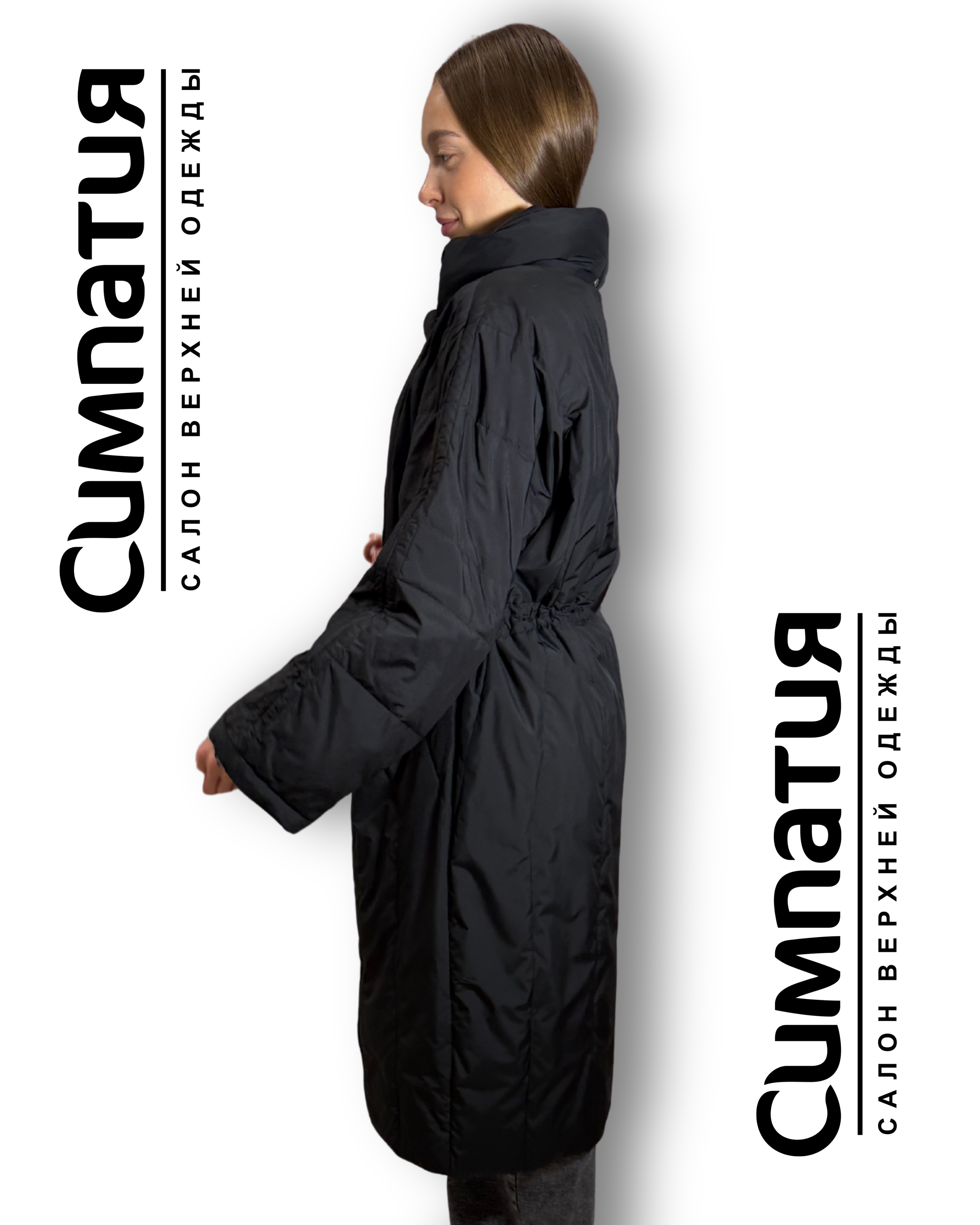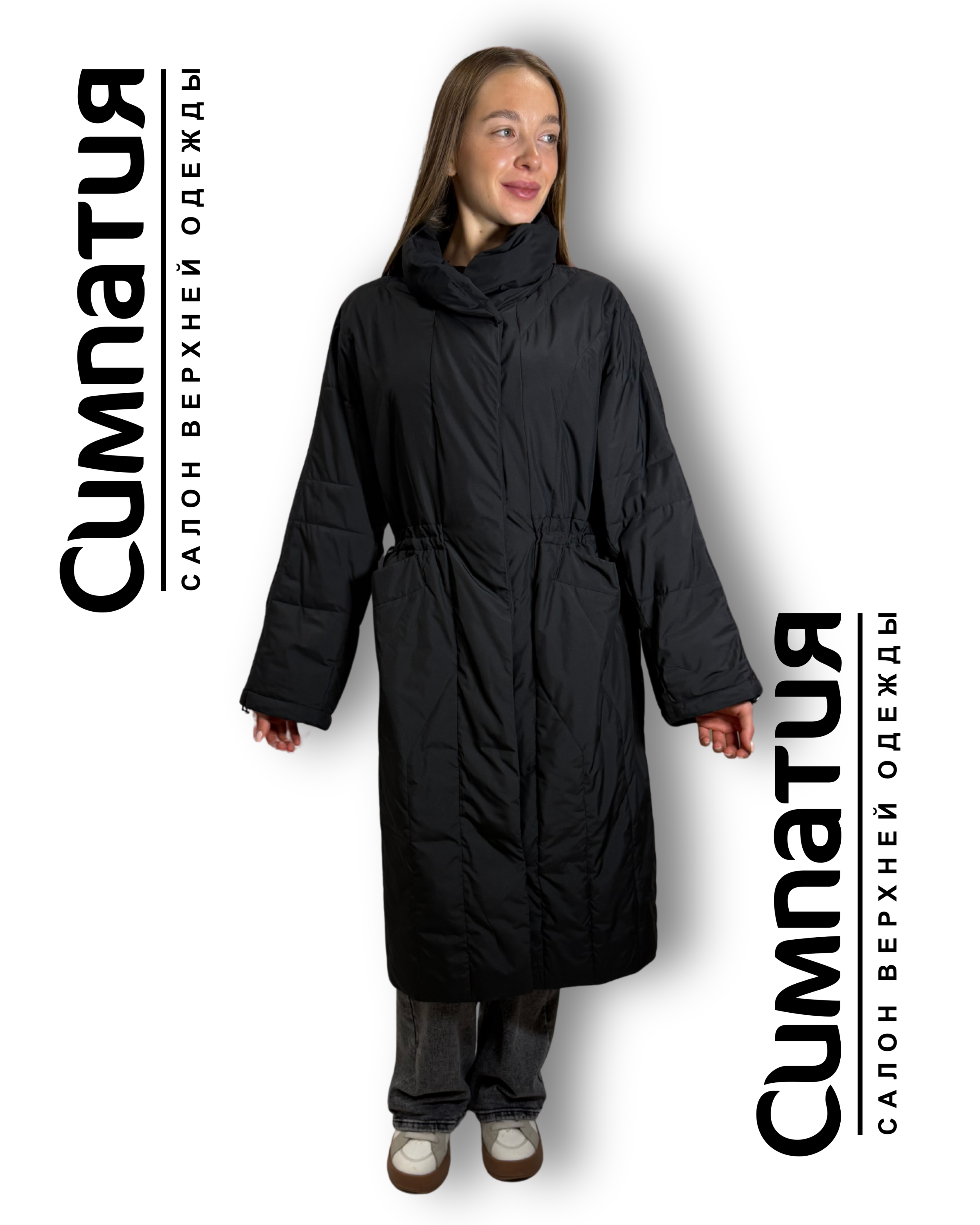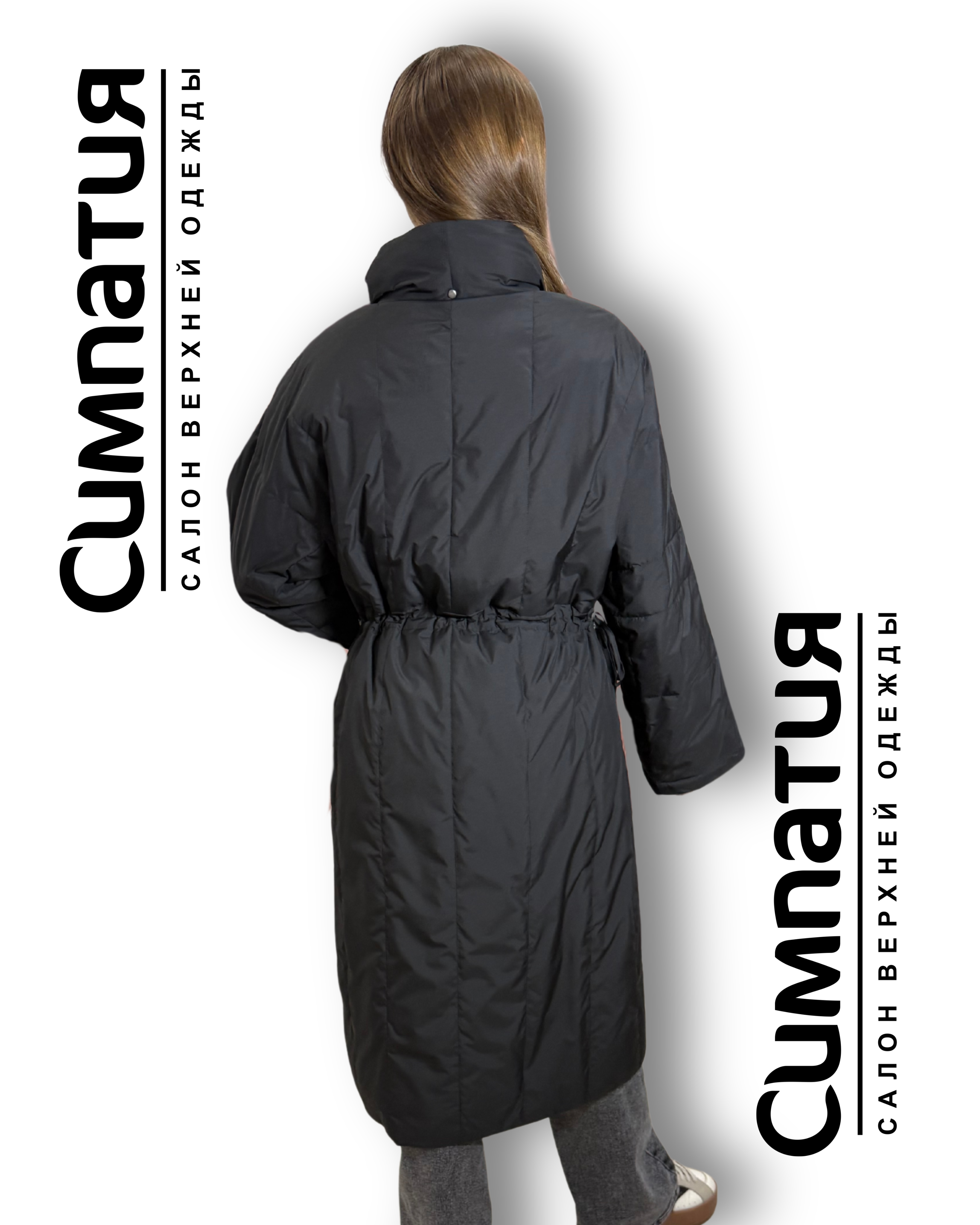 Куртка свободного кроя в длине макси с кулисками на талии и глубокими карманами в черном цвете