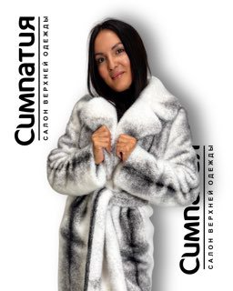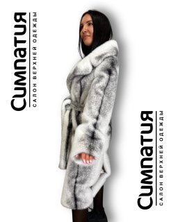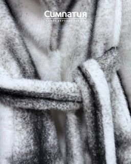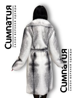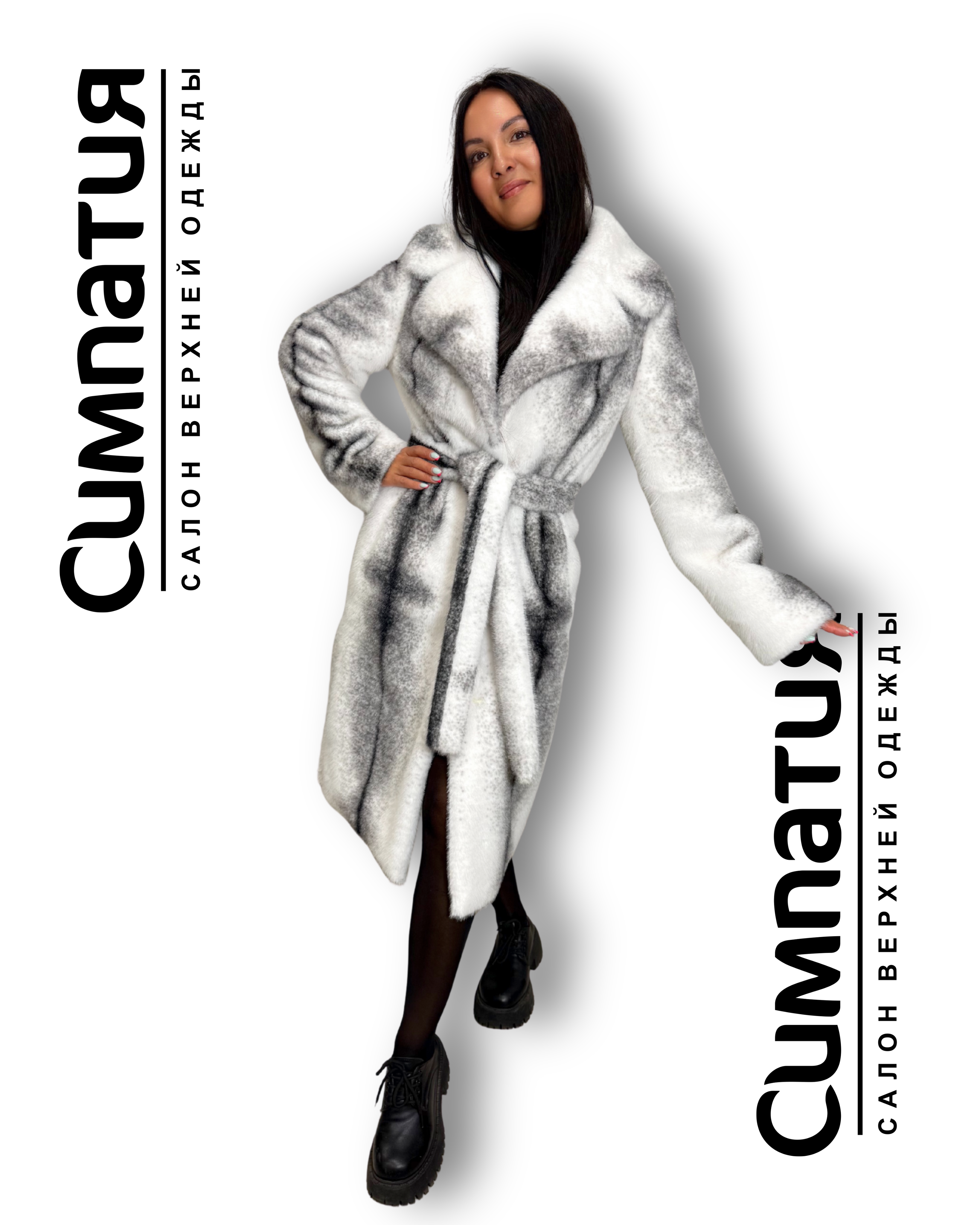 Шубка из эко меха белого цвета с контрастными черными полосами с поясом