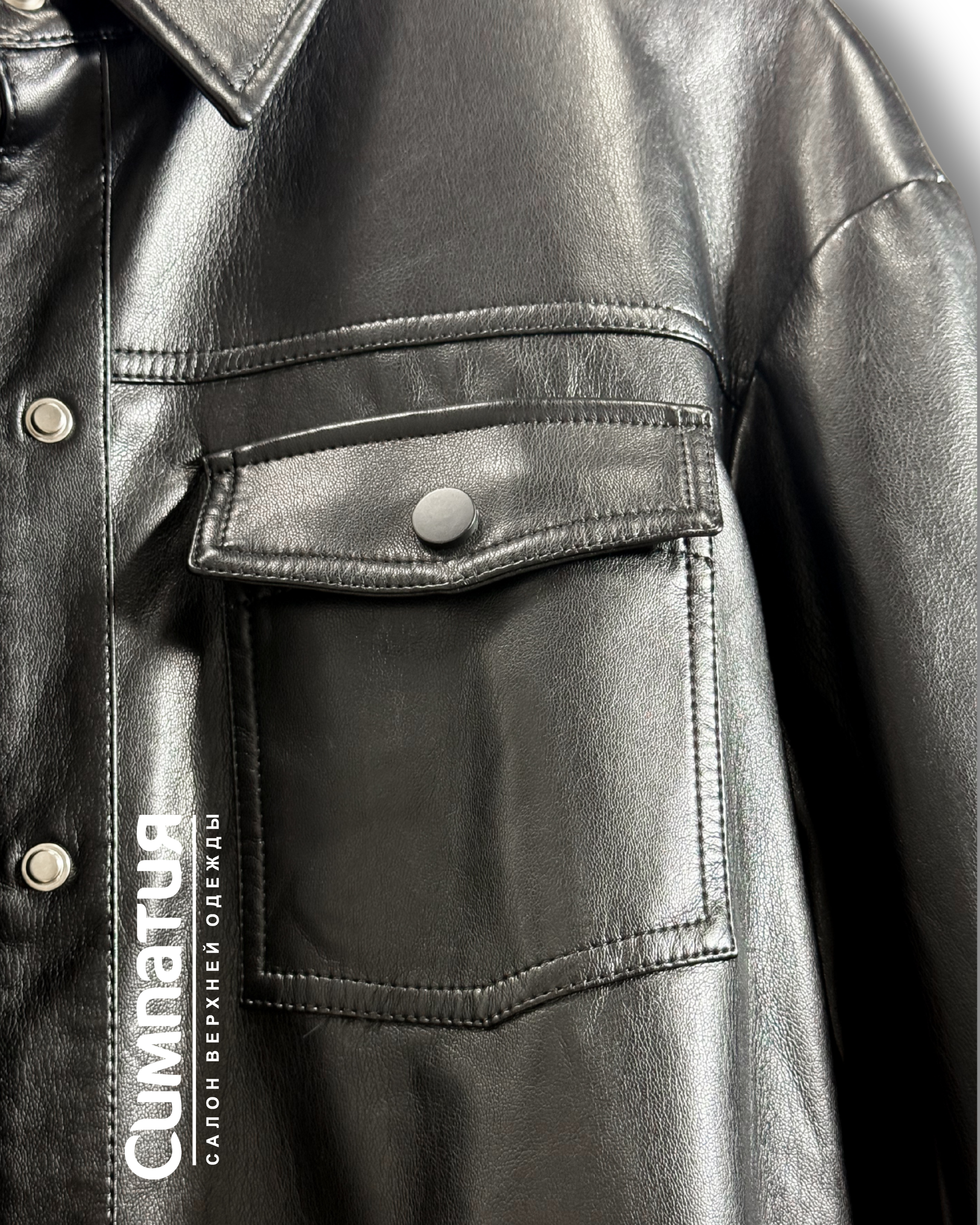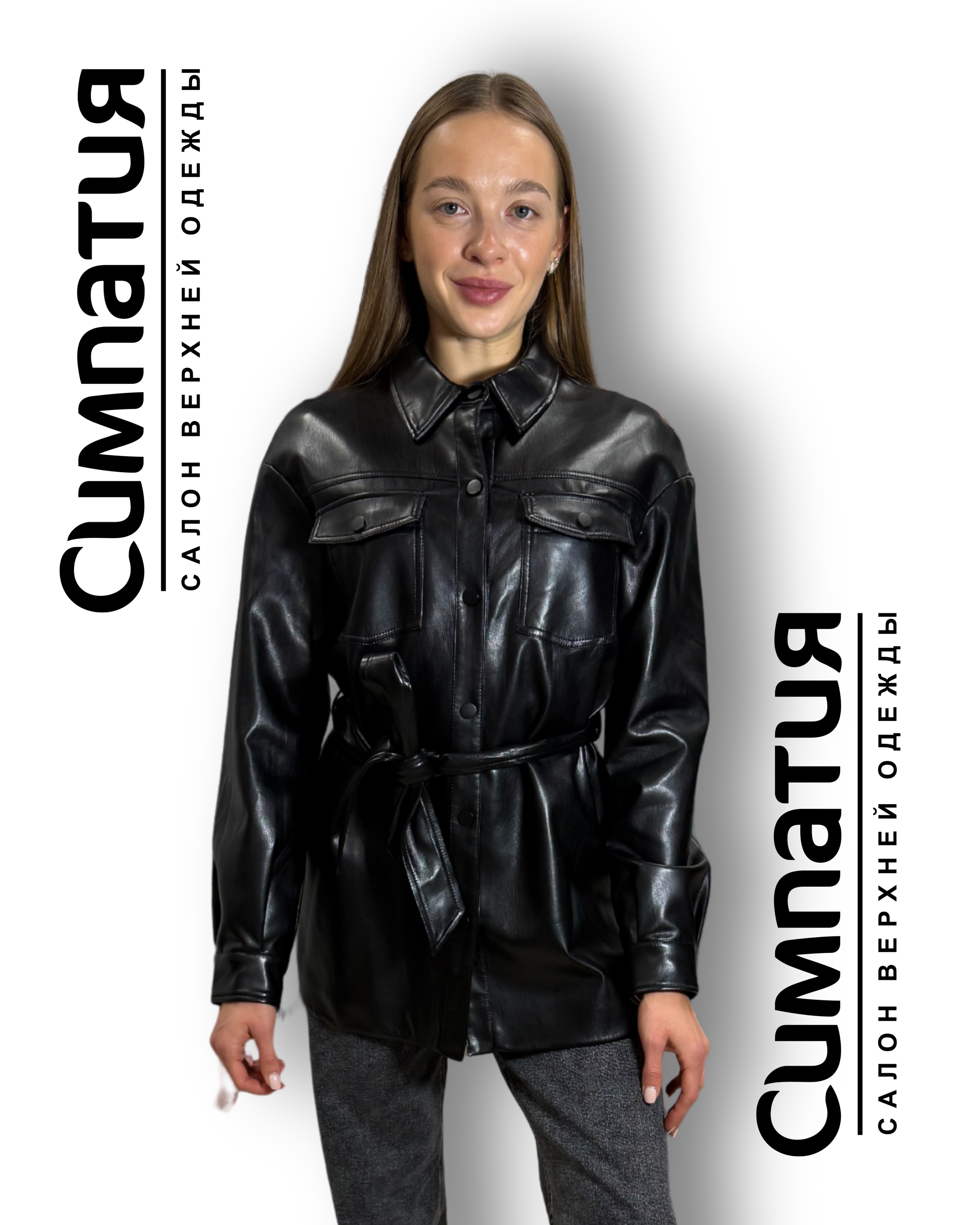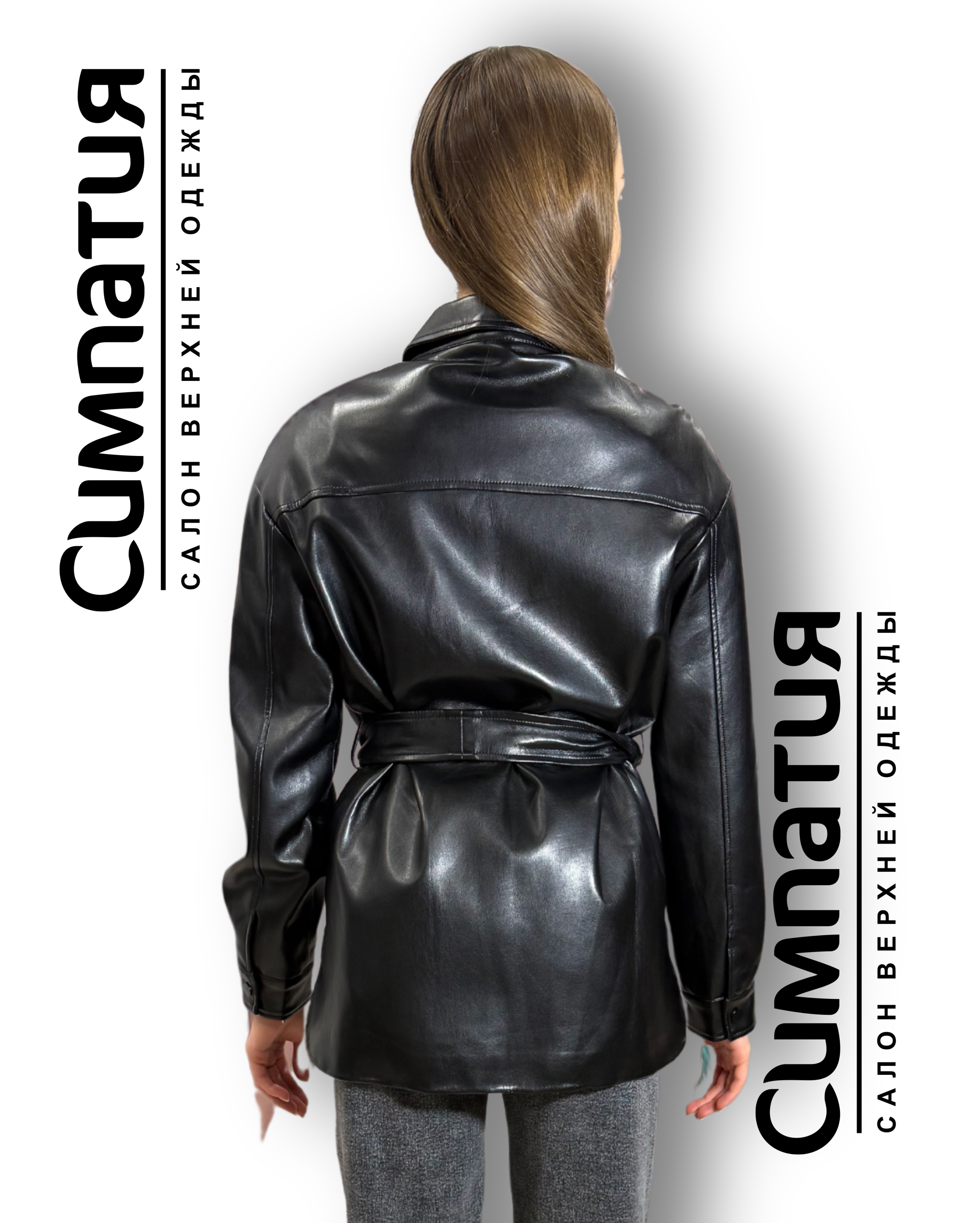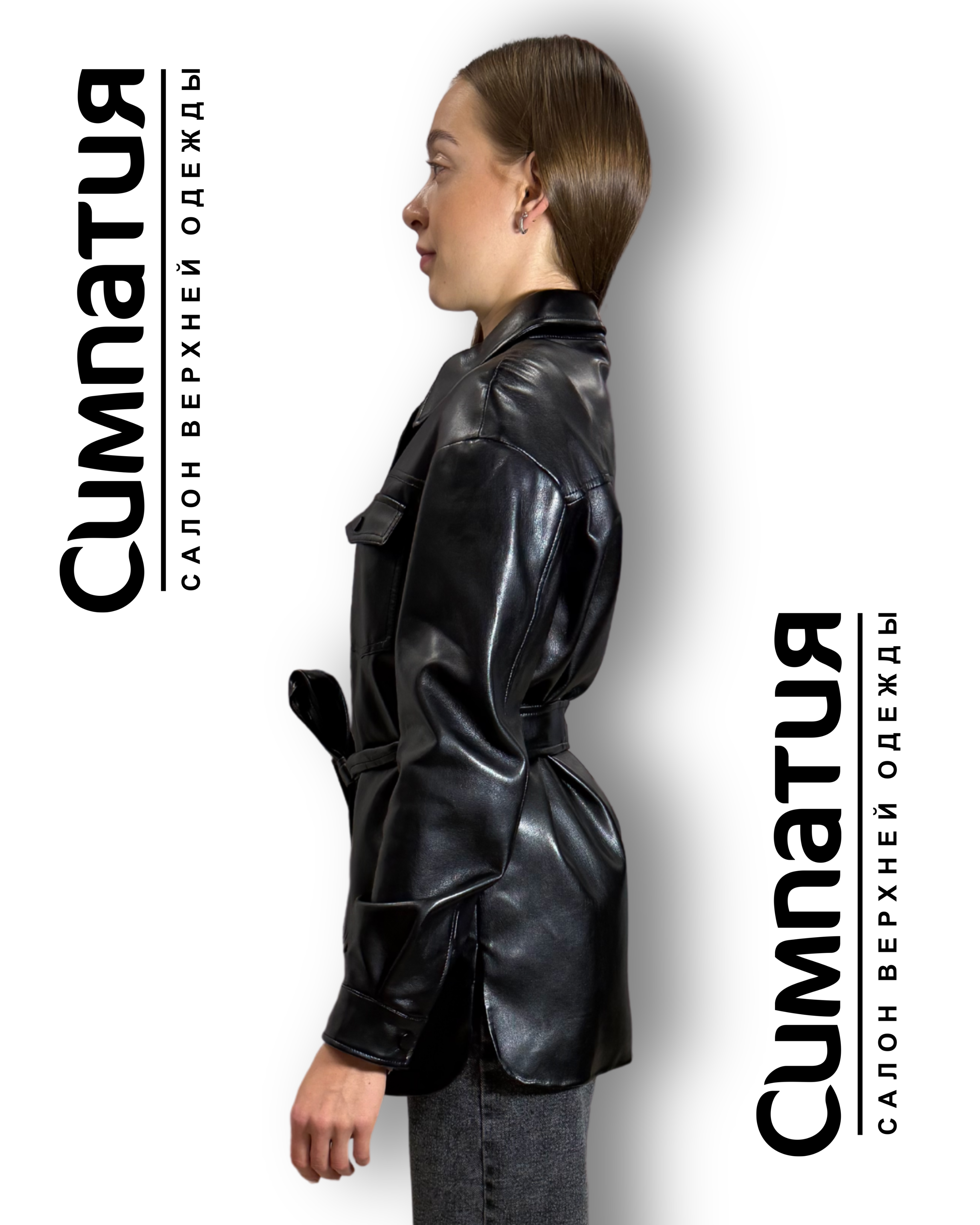Стильная куртка-рубашка из блестящей эко-кожи в классическом чёрном цвете