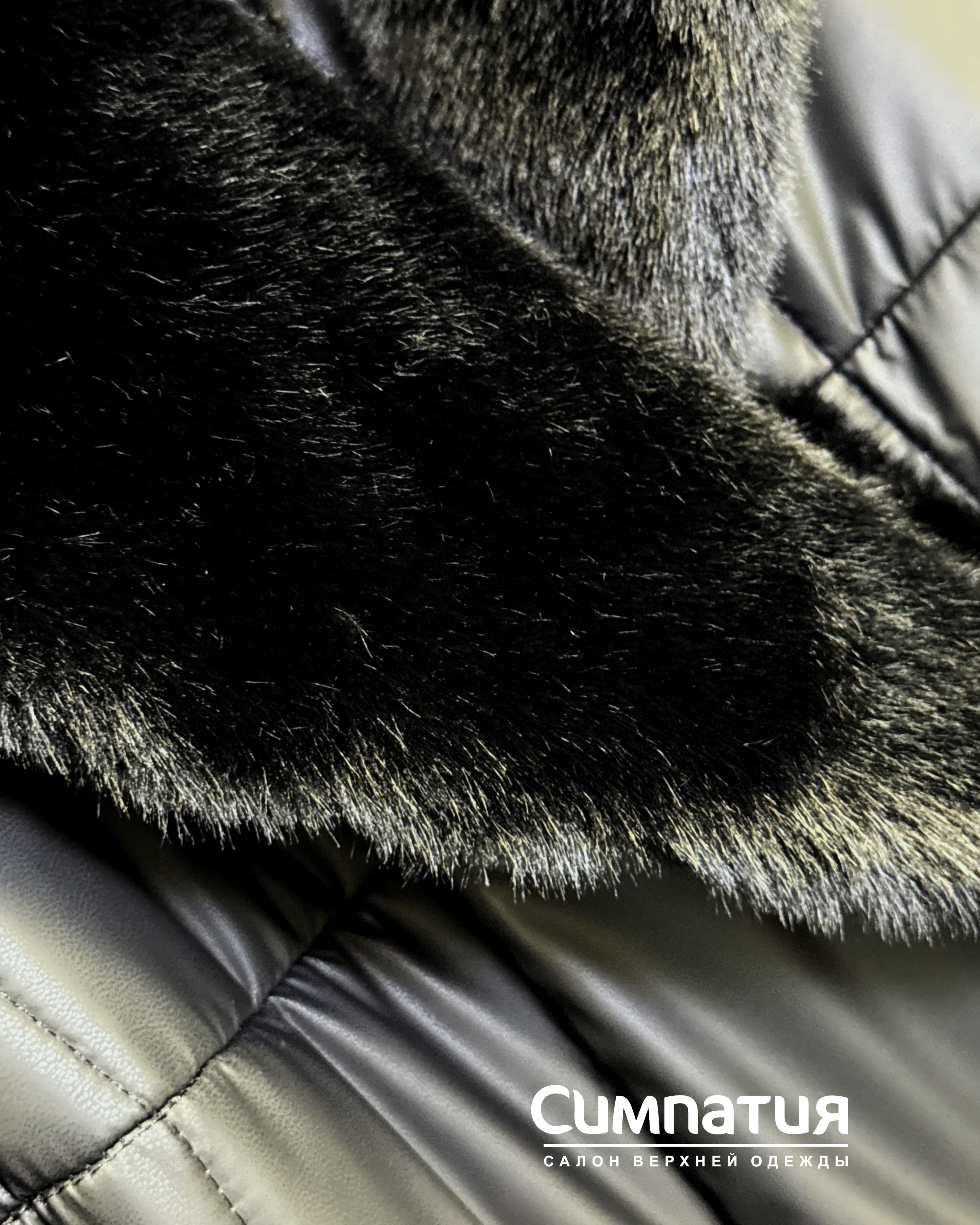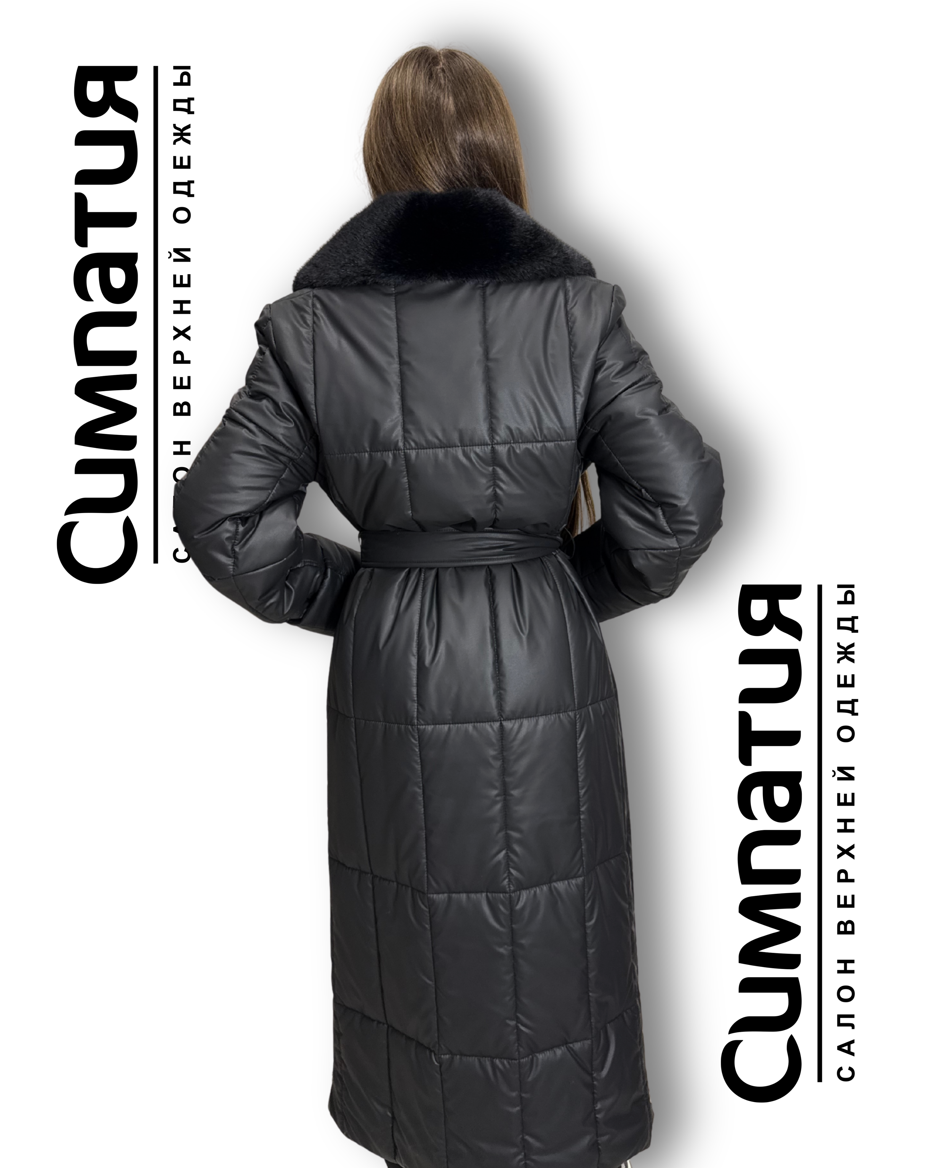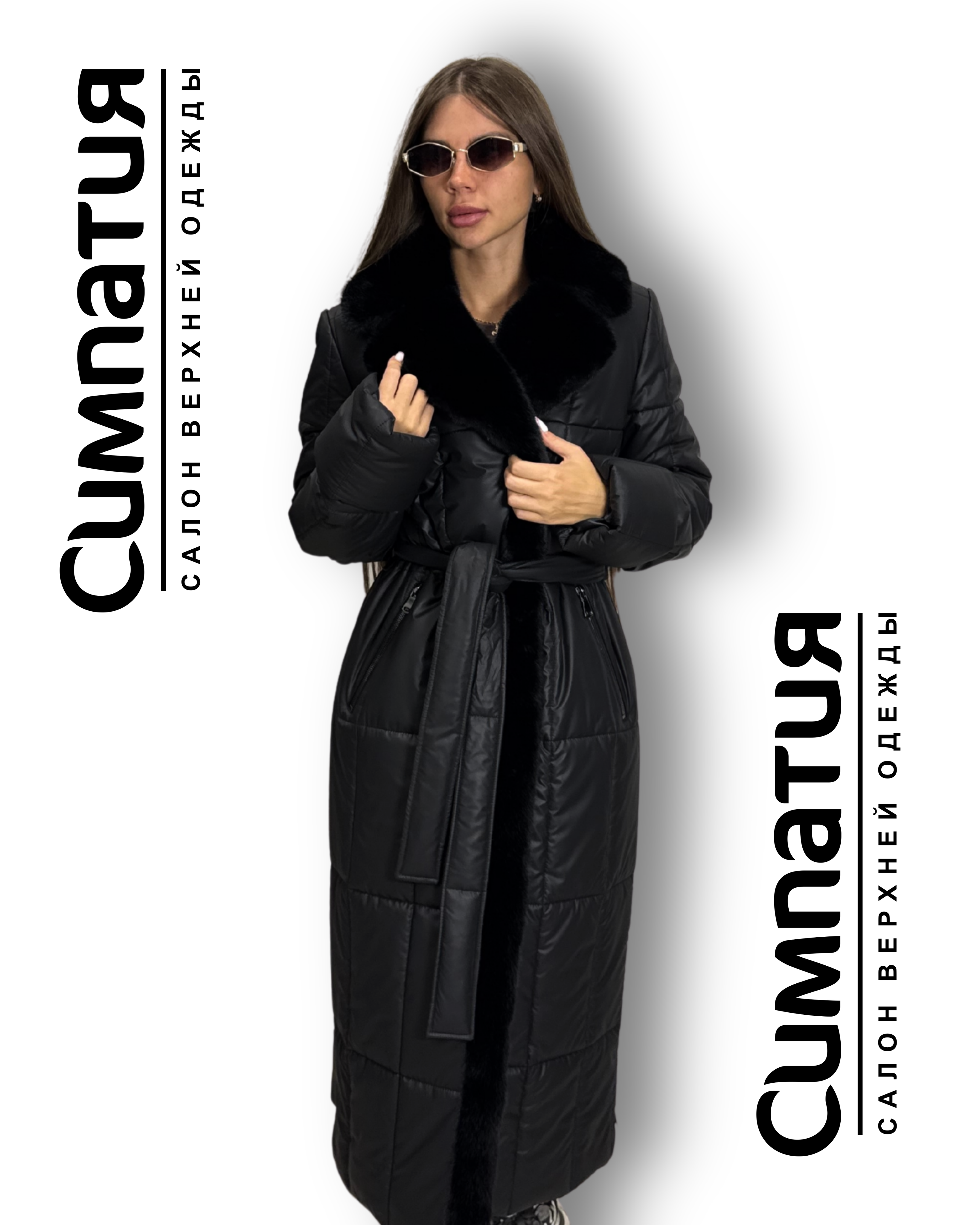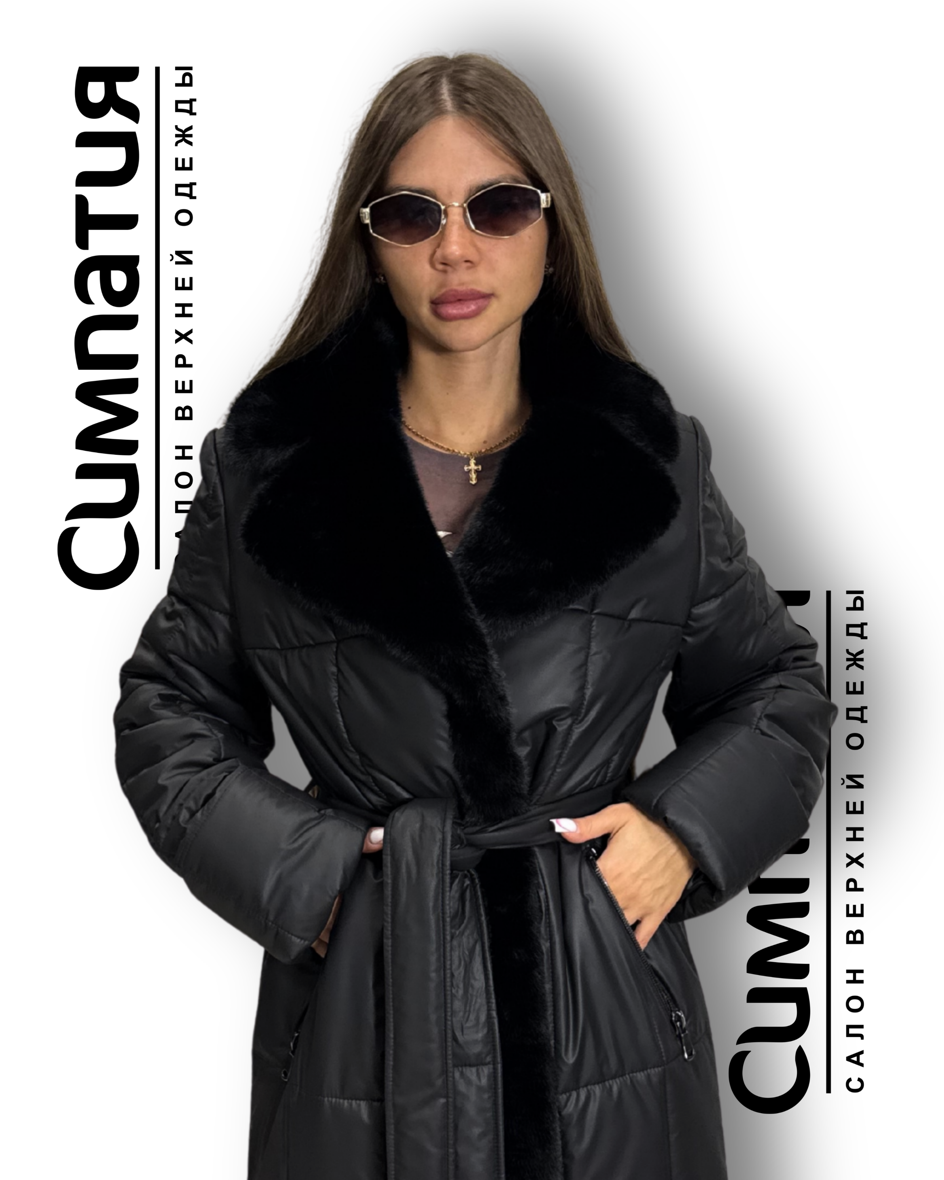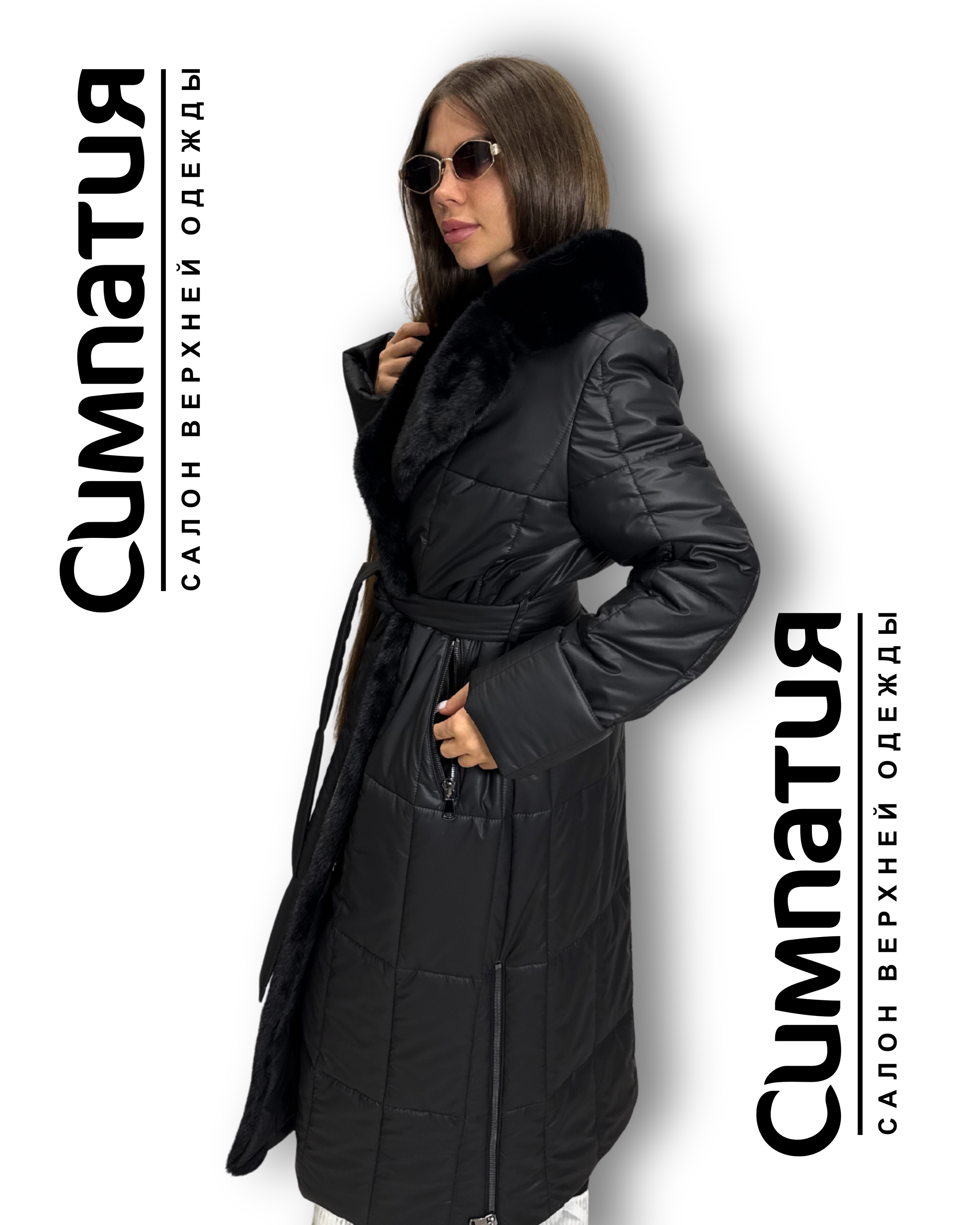 Стильное пальто в черном цвете с декоративными деталями: воротник и по длине из эко меха норки. С поясом и молниями на карманах и боках. Застегивается на молнию и кнопки.