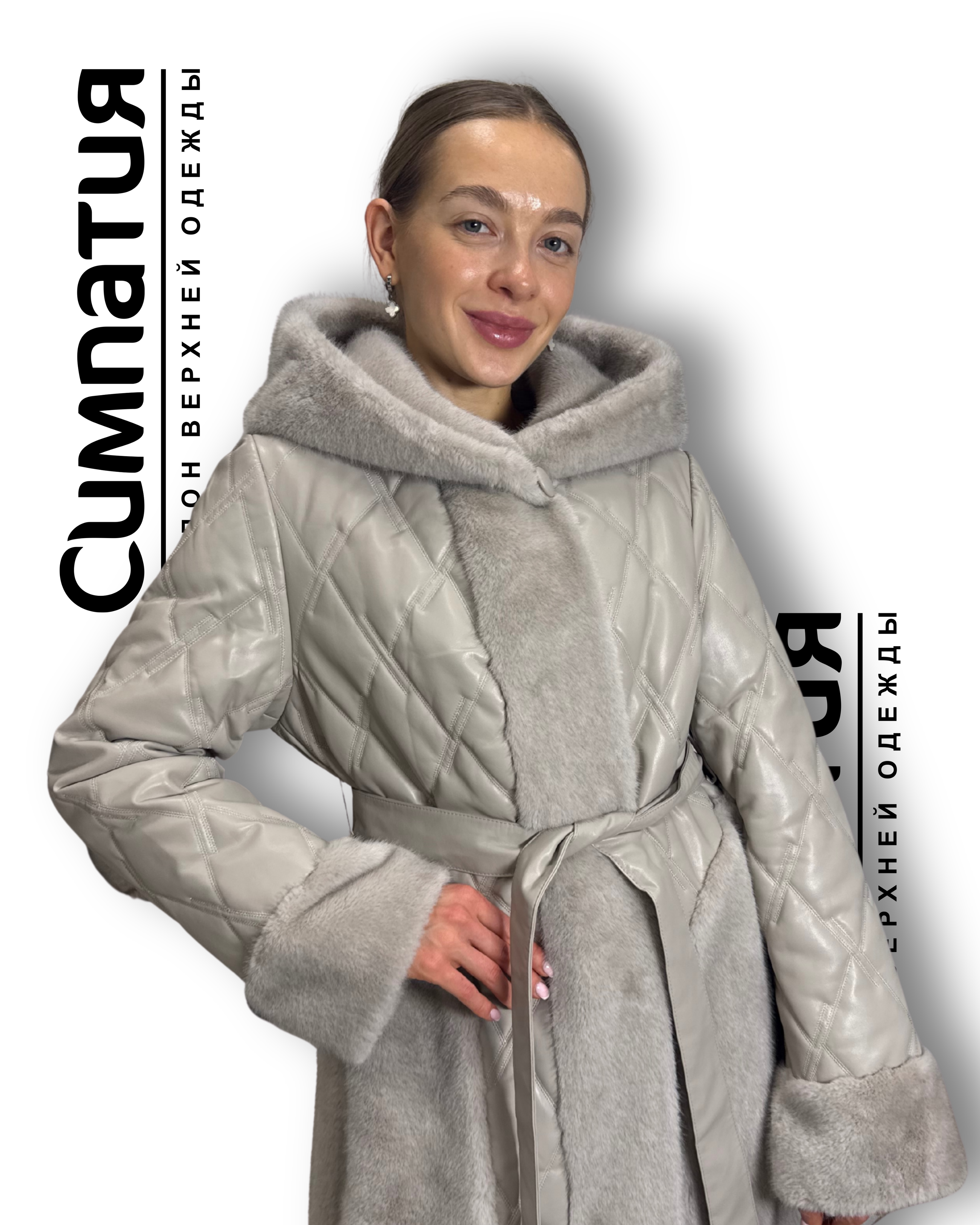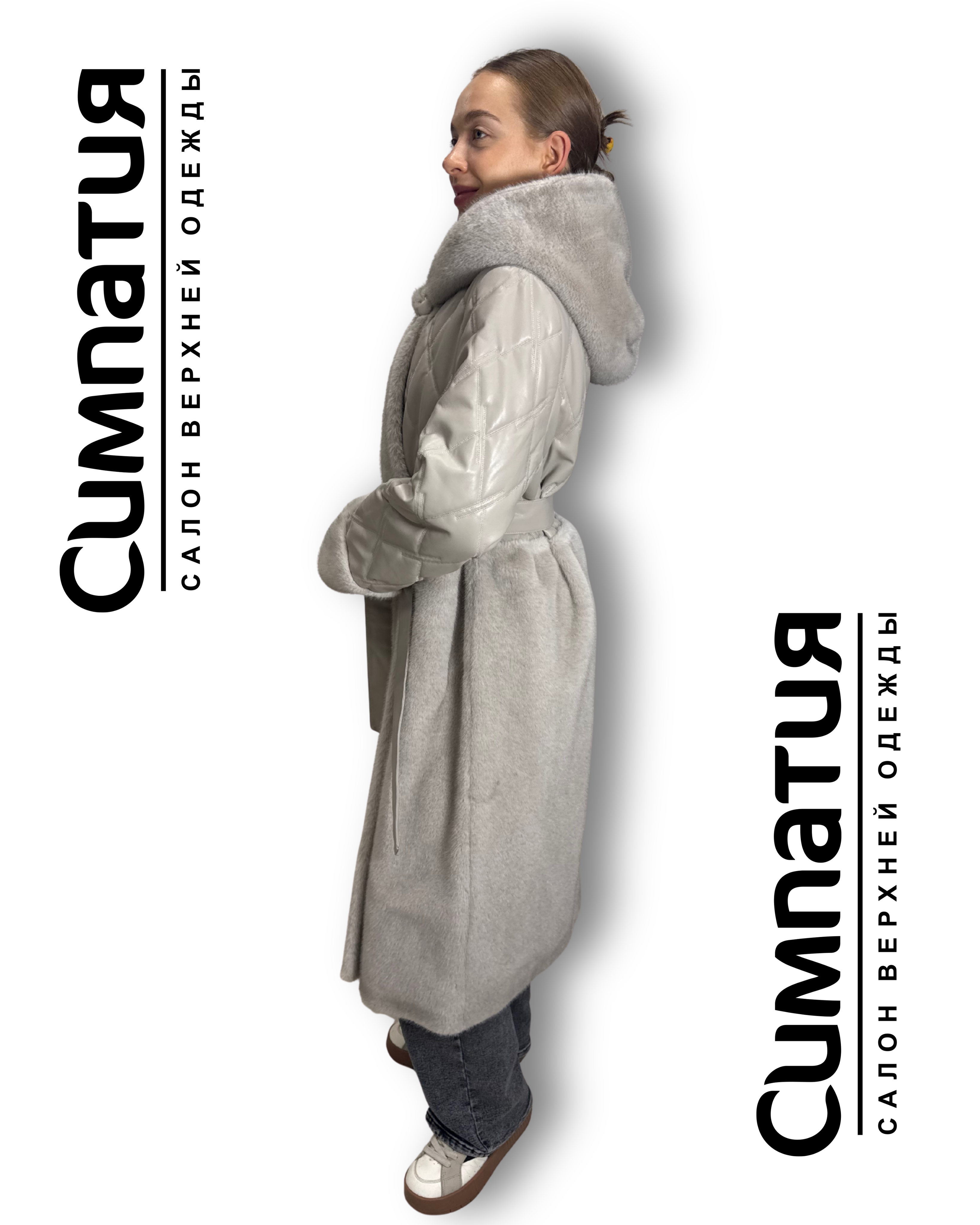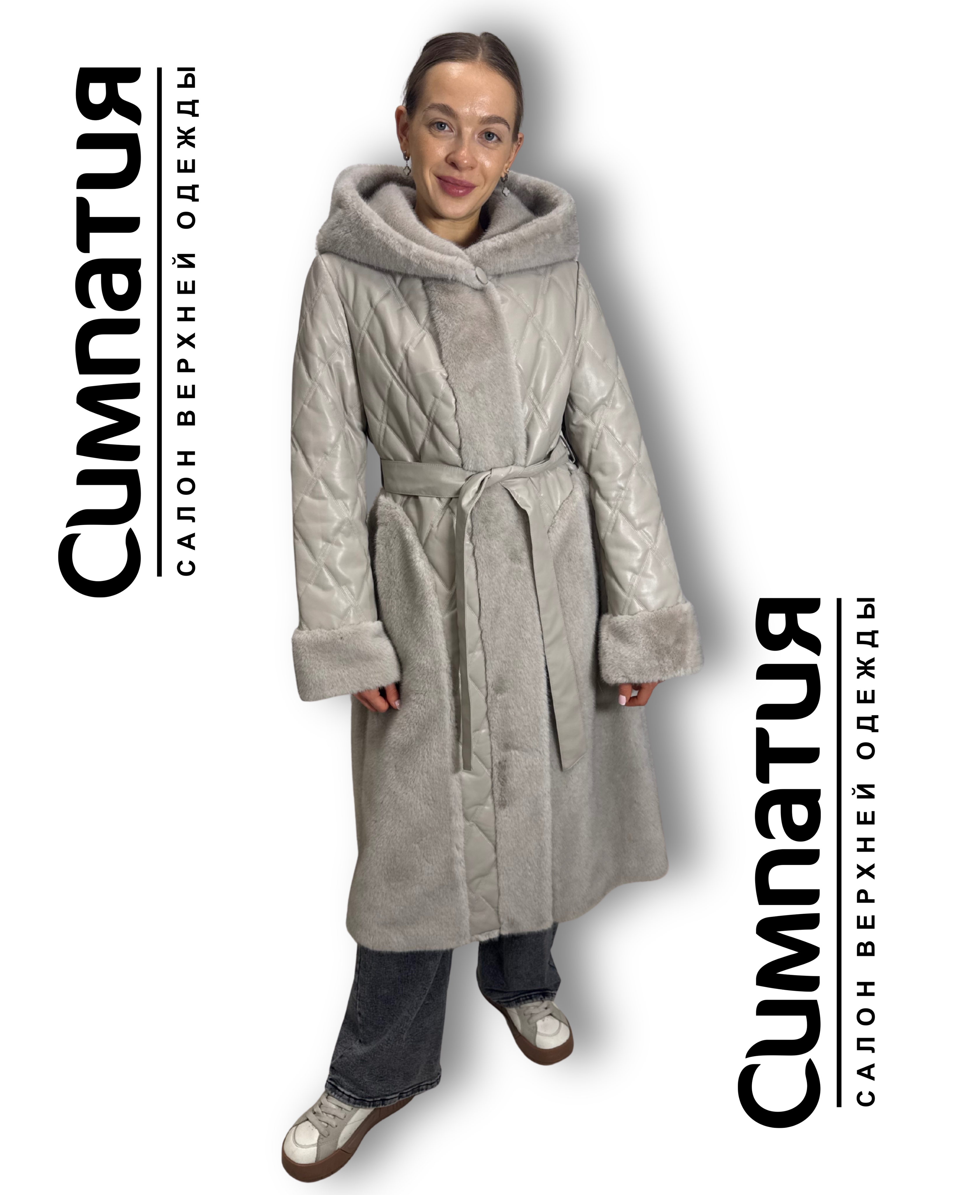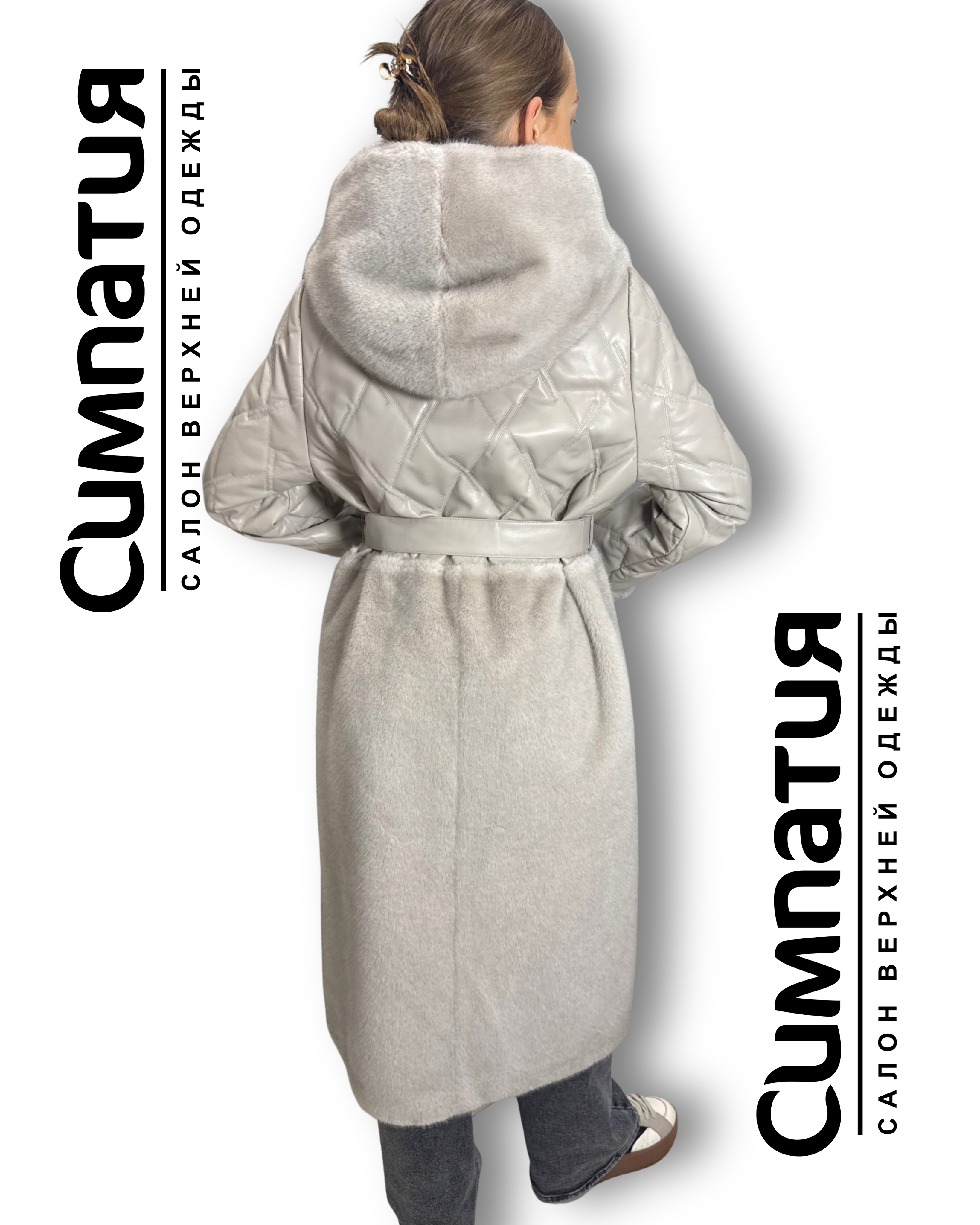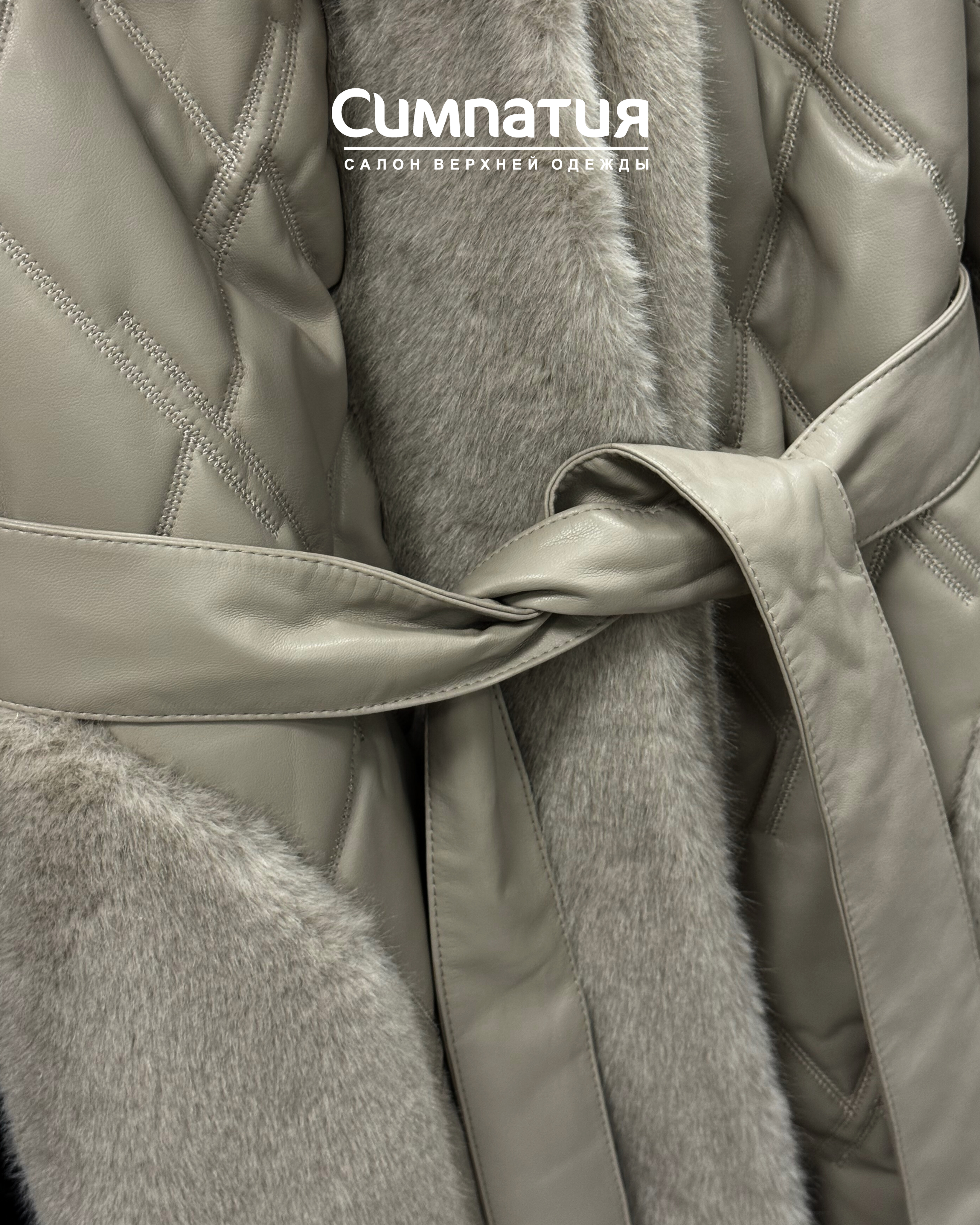 Стильное пальто в серебристом цвете с декоративными деталями