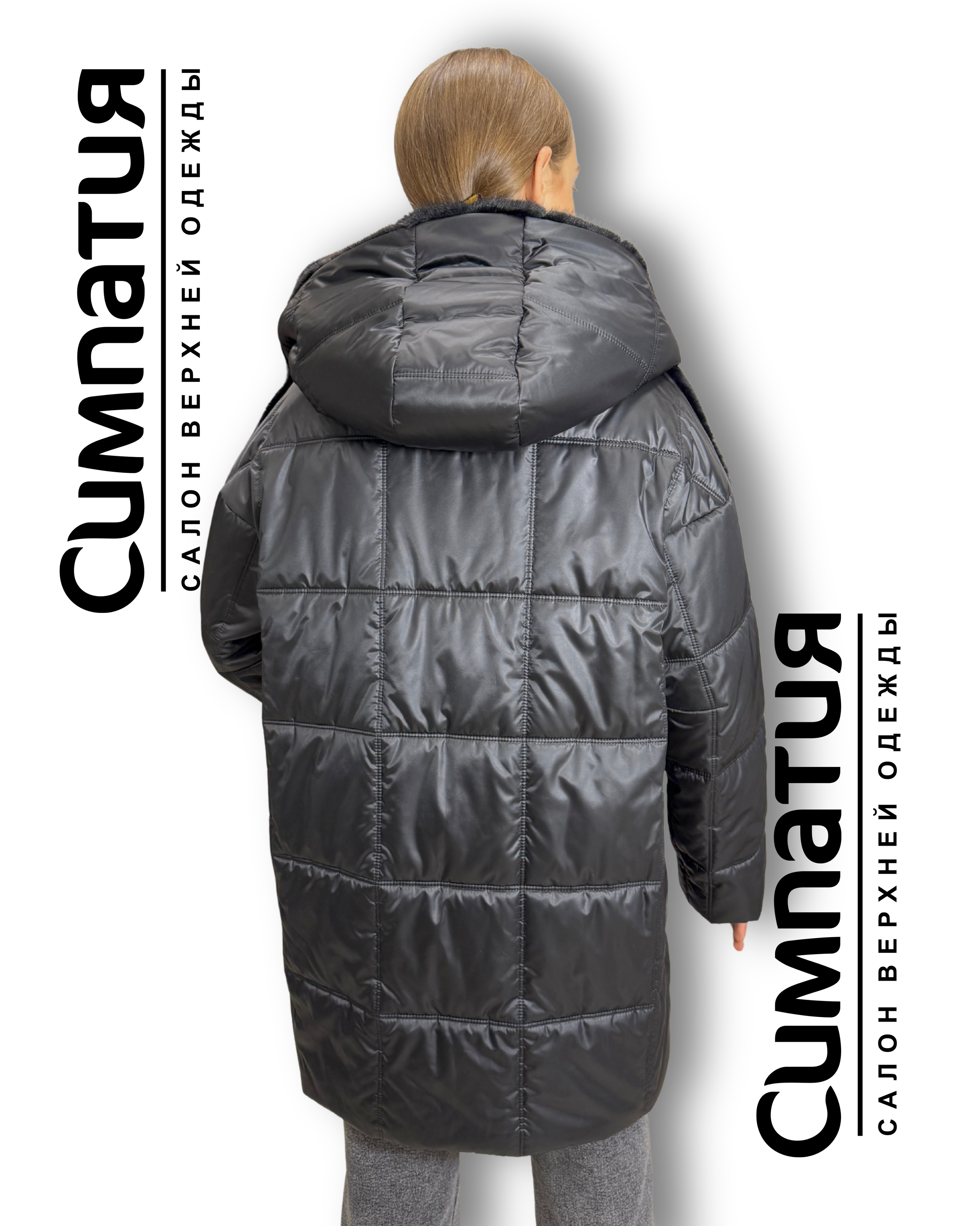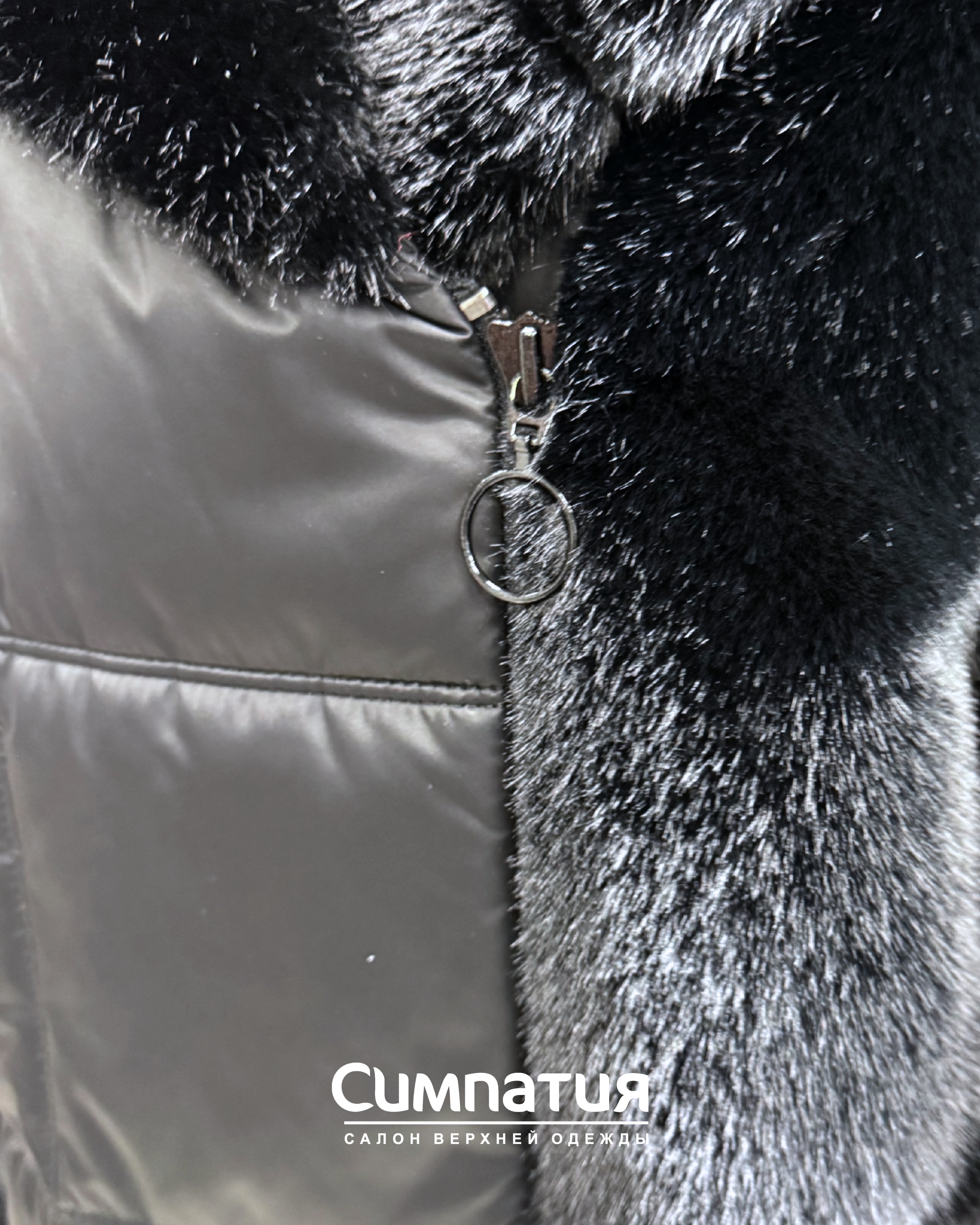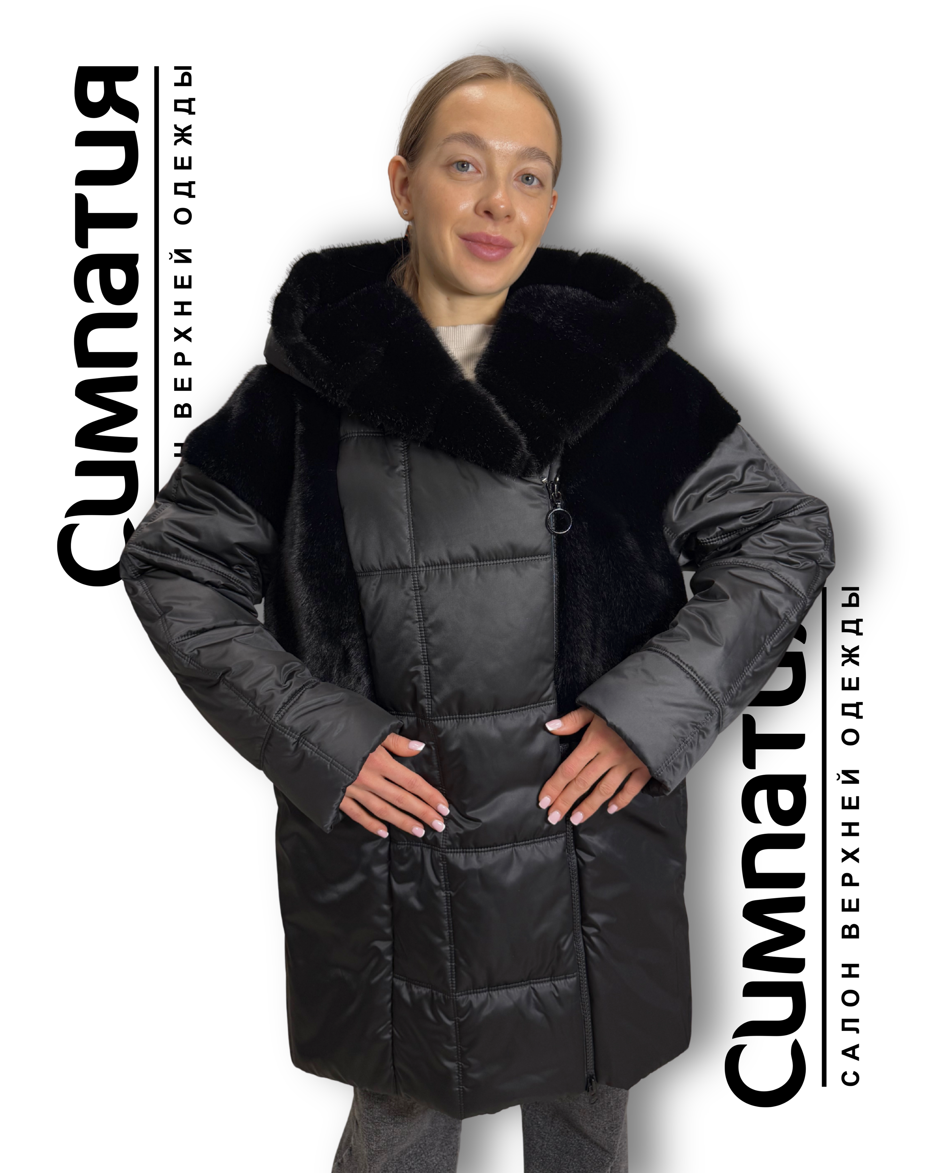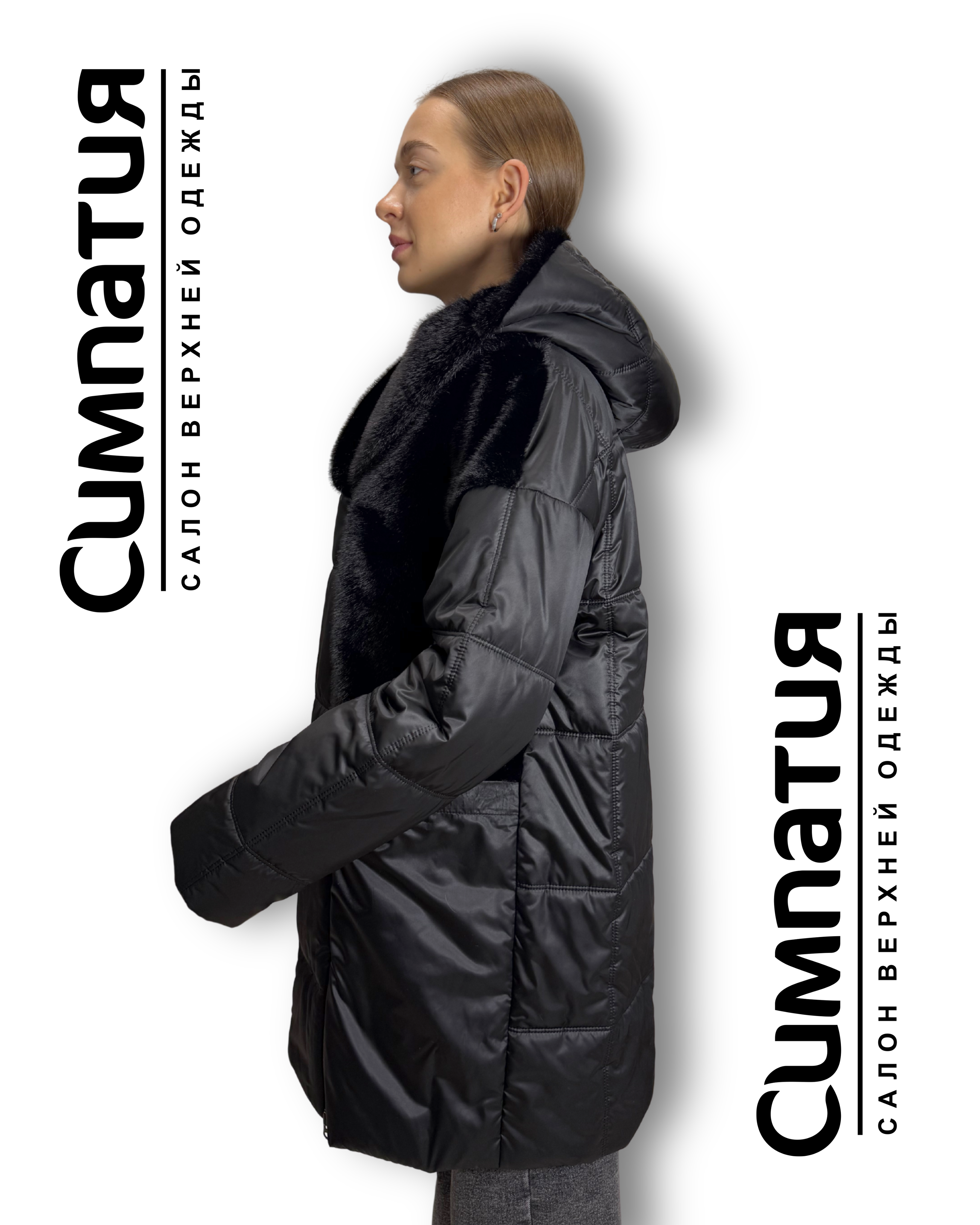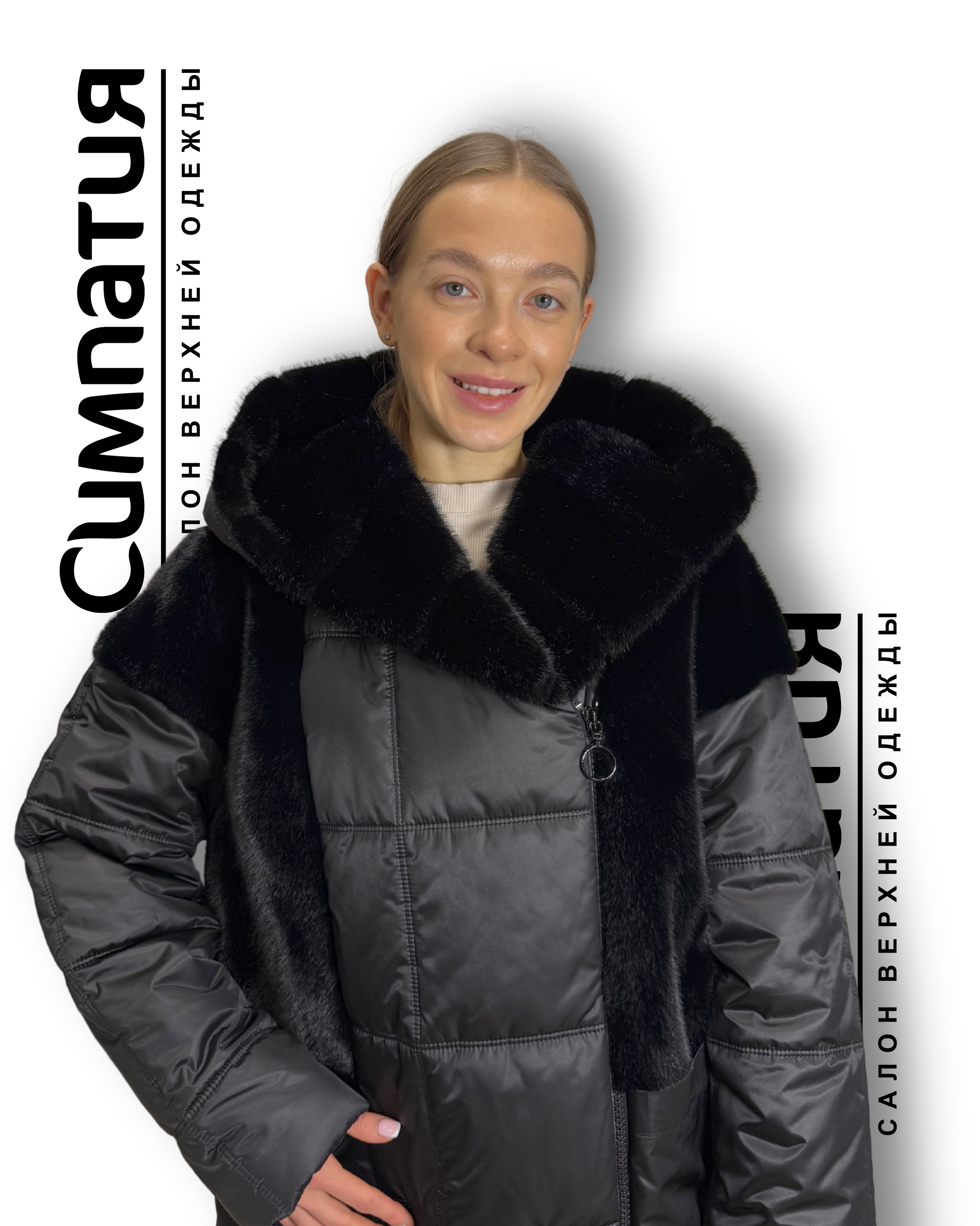 Теплое пальто черного цвета и отделкой из эко меха норки